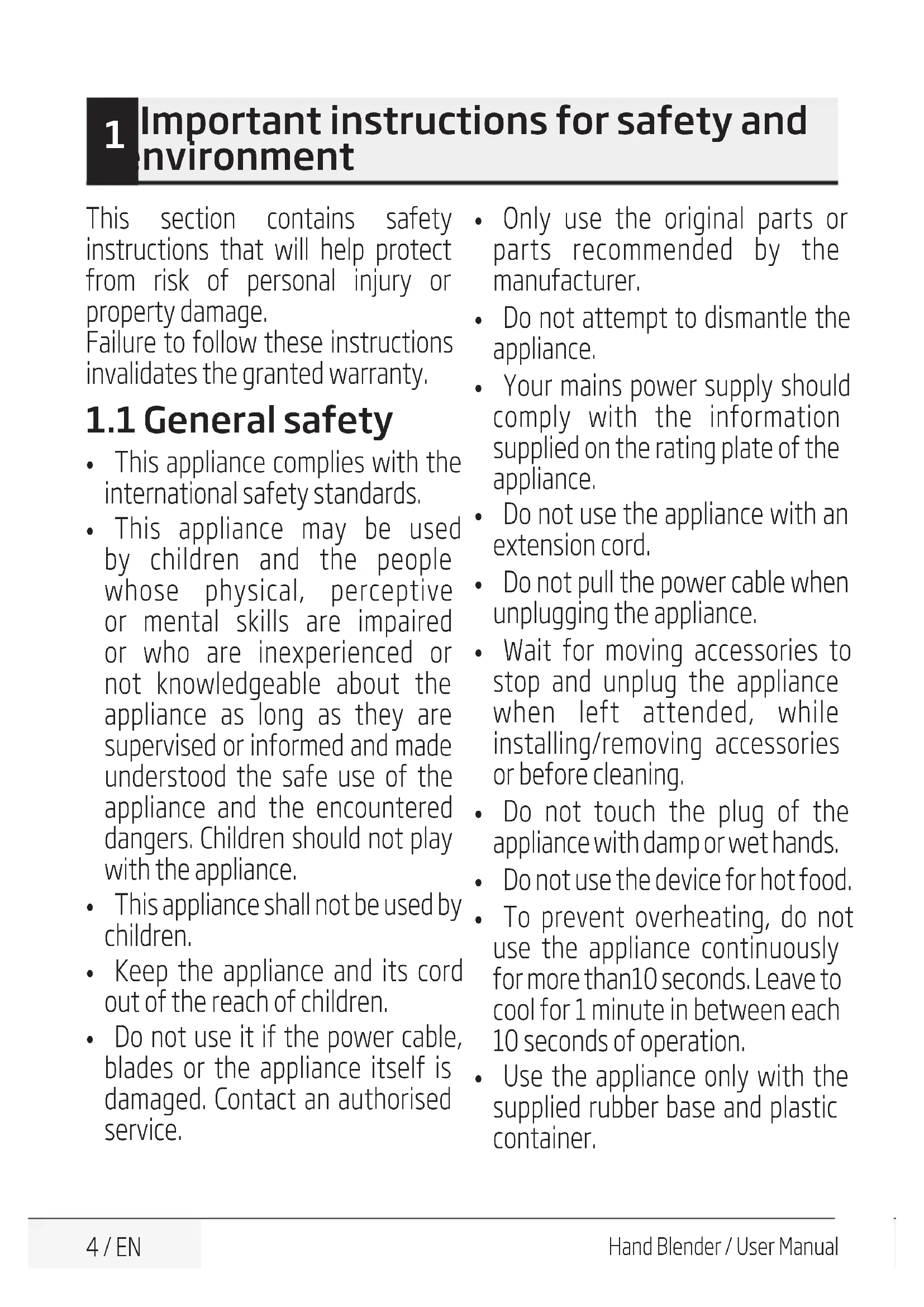 Hand Blender / User Manual This section contains safety instructions that will help protect from risk of personal injury or property damage. Failure to follow these instructions invalidates the granted warranty.