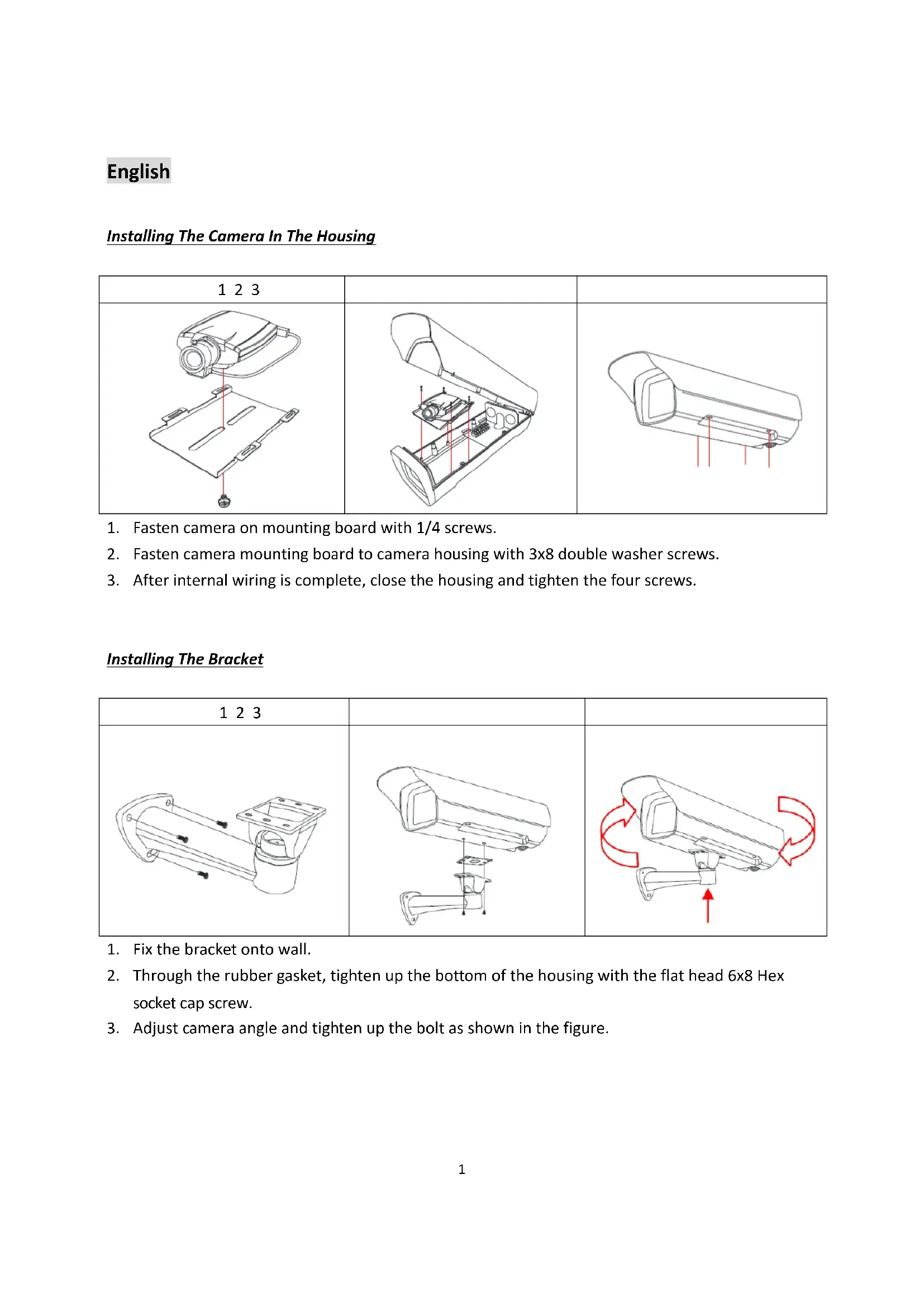 2. Fasten camera mounting board to camera housing with 3x8 double washer screws.