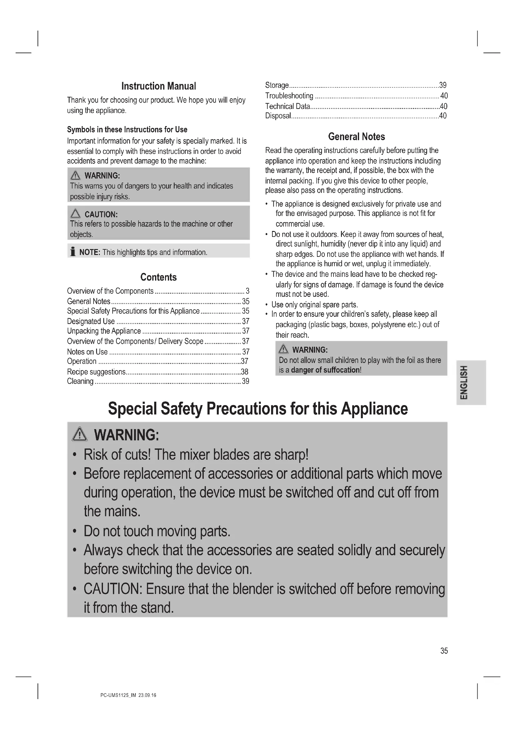 - Objects like spoons or scrapers never may be in the mixing vessel during operation.37 PC-UMS1125_IM 23.09.16 Designated Use This device is used for: