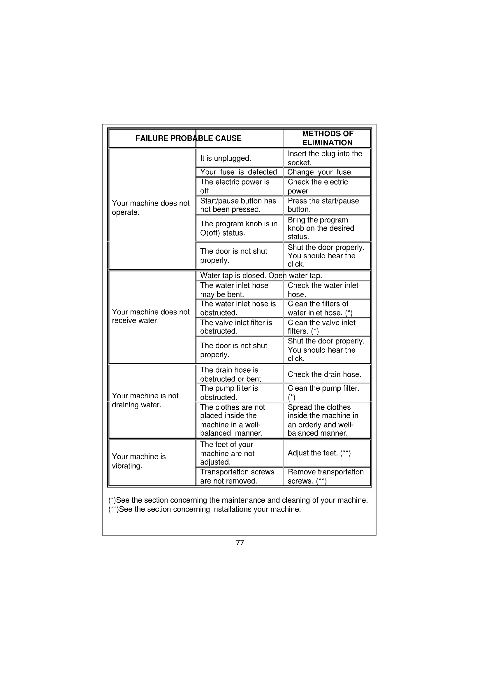 | Your machine is vibrating. | The feet of your machine are not adjusted. | Adjust the feet.(**) |