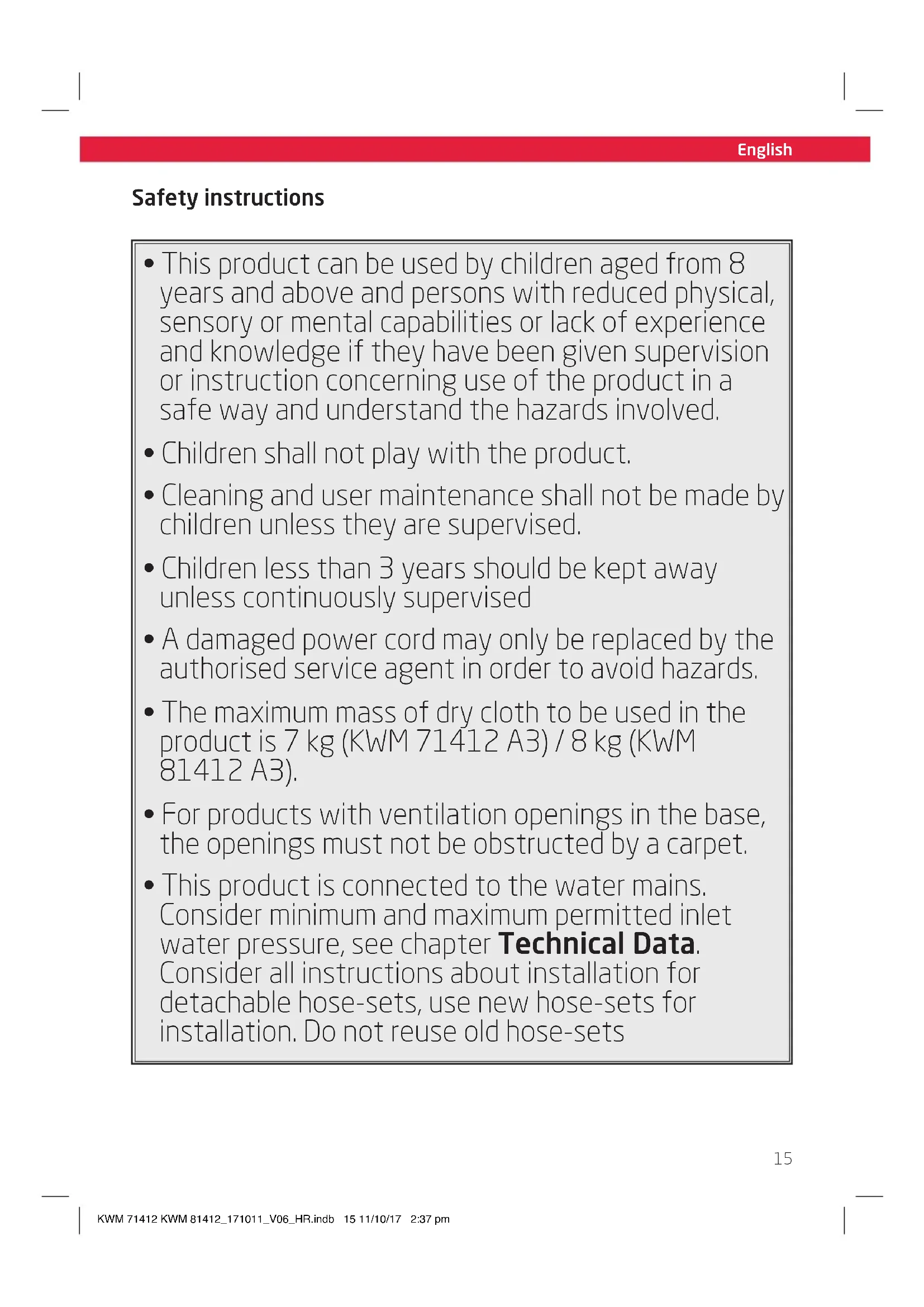 - This product is connected to the water mains. Consider minimum and maximum permitted inlet water pressure, see chapter Technical Data. Consider all instructions about installation for detachable hose-sets, use new hose-sets for installation. Do not reuse old hose-sets KWM 71412 KWM 81412_171011_V06_HR.indb 15 11/10/17 2:37 pmEnglish