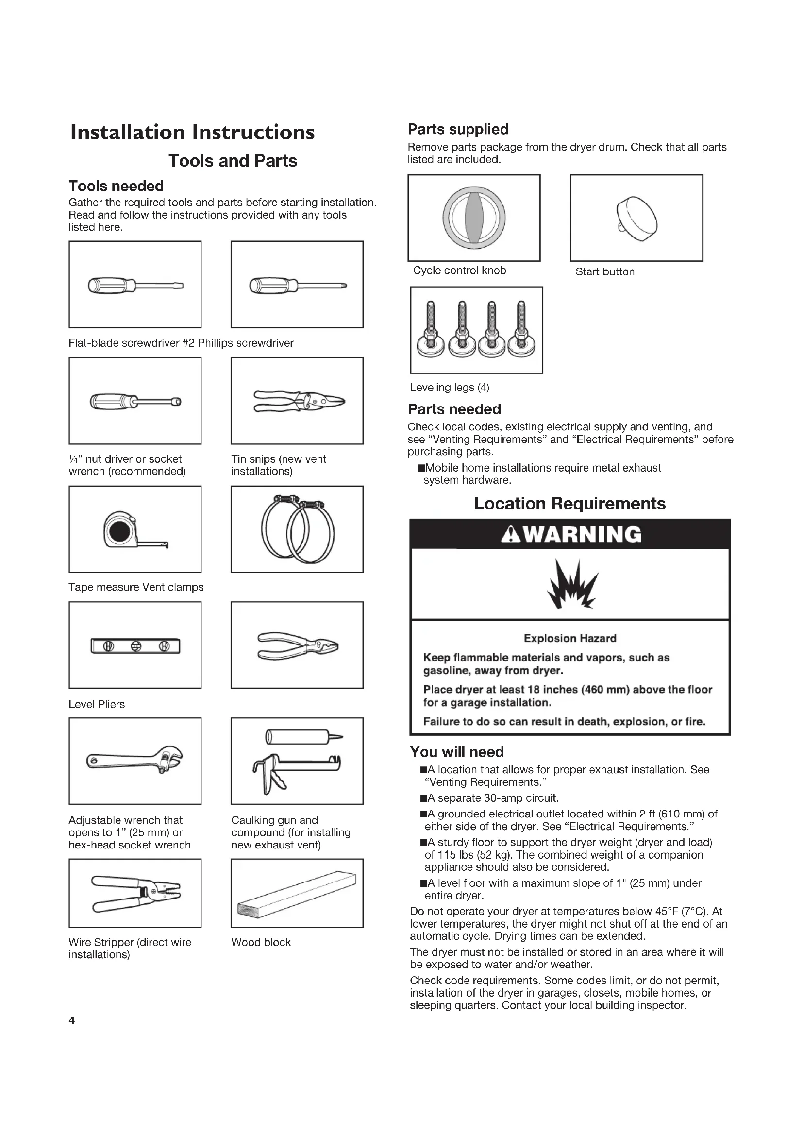 easily determined.The cost of repair or replacement under these excluded circumstances shall be borne by the customer. DISCLAIMER OF IMPLIED WARRANTIESIMPLIED WARRANTIES, INCLUDING ANY IMPLIED WARRANTY OF MERCHANTABILITY OR IMPLIED WARRANTY OF FITNESS FOR A PARTICULAR PURPOSE, ARE LIMITED TO ONE YEAR OR THE SHORTEST PERIOD ALLOWED BY LAW. Some states and provinces do not allow limitations on the duration of implied warranties of merchantability or fitness, so this limitation may not apply to you. This warranty gives you specific legal rights, and you also may have other rights that vary from state to state or province to province.DISCLAIMER OF REPRESENTATIONS OUTSIDE OF WARRANTY Amana makes no representations about the quality, durability, or need for service or repair of this major appliance other than the representations contained in this warranty. If you want a longer or more comprehensive warranty than the limited warranty that comes with this major appliance, you should ask Amana or your retailer about buying an extended warranty.LIMITATION OF REMEDIES; EXCLUSION OF INCIDENTAL AND CONSEQUENTIAL DAMAGES YOUR SOLE AND EXCLUSIVE REMEDY UNDER THIS LIMITED WARRANTY SHALL BE PRODUCT REPAIR AS PROVIDED HEREIN. AMANA SHALL NOT BE LIABLE FOR INCIDENTAL OR CONSEQUENTIAL DAMAGES. Some states and provinces do not allow the exclusion or limitation of incidental or consequential damages, so these limitations and exclusions may not apply to you. This warranty gives you specific legal rights, and you also may have other rights that vary from state to state or province to province.23 Notes24 Sécurité de la sécheuse2526 Instructions d’installation Outillage et pièces Outils nécessaires Rassembler les outils et pièces nécessaires avant d’entreprendre l’installation. Lire et observer les instructions fournies avec chacun des outils de la liste ci-dessous. Tournevis à lame plate Tournevis Phillips n° 2 Tourne-écrou ou clé à douille de ¼" (recommandé) Cisaille de ferblantier (pour l’installation d’un nouveau conduit) Mètre-ruban Brides de conduit Niveau Pince Clé à molette avec ouverture jusqu'à 1" (25 mm) ou clé à douille hexagonale Pistolet à calfeutrage et composé de calfeutrage (pour l’installation d’un nouveau conduit d’évacuation) Pince à dénuder (pour les installations à raccordement direct) Cale en bois Pièces fournies Retirer le sachet de pièces du tambour de la sécheuse. Vérifier que toutes les pièces énumérées sont présentes. Bouton de commande des programmes Bouton Start (mise en marche) Pieds de nivellement (4) Pièces nécessaires Consulter les codes locaux, les “Exigences concernant l'évacuation” et les “Spécifications électriques”, vérifier l'alimentation électrique et le circuit d'évacuation existants, avant d'acheter les pièces nécessaires. ■ Pour les installations en résidence mobile, le circuit d’évacuation nécessite des matériaux métalliques. Exigences d’emplacement Il vous faudra ■ Un emplacement permettant une évacuation appropriée. Voir “Exigences concernant l'évacuation”. ■ Un circuit séparé de 30 ampères. ■ Une prise électrique avec liaison à la terre située à moins de 2 pi (610 mm) de l’un des côtés de la sécheuse. Voir “Spécifications électriques”. ■ Un plancher robuste pour supporter la sécheuse avec un poids total (sécheuse et charge) de 115 lb (52 kg). Il faut aussi prendre en compte le poids combiné d'un appareil ménager voisin. ■ Un plancher de niveau ayant une pente maximale de 1" (25 mm) sous l’ensemble de la sécheuse.27 Ne pas faire fonctionner la sécheuse à des températures inférieures à 45°F (7°C). À des températures inférieures, la sécheuse risque de ne pas s’arrêter à la fin d’un programme automatique. Les durées de séchage risquent alors d’augmenter. La ne doit pas être installée ou remisée dans un endroit où elle sera exposée à l’eau et/ou aux intempéries. Vérifier les spécifications des codes. Certains codes limitent ou interdisent l’installation des sécheuses dans un garage, un placard, une résidence mobile ou une chambre à coucher. Contacter l’inspecteur en bâtiments local. Distances de dégagement à respecter L’emplacement doit être assez grand pour permettre d’ouvrir complètement la porte de la sécheuse. Dimensions de la sécheuse Vue de face