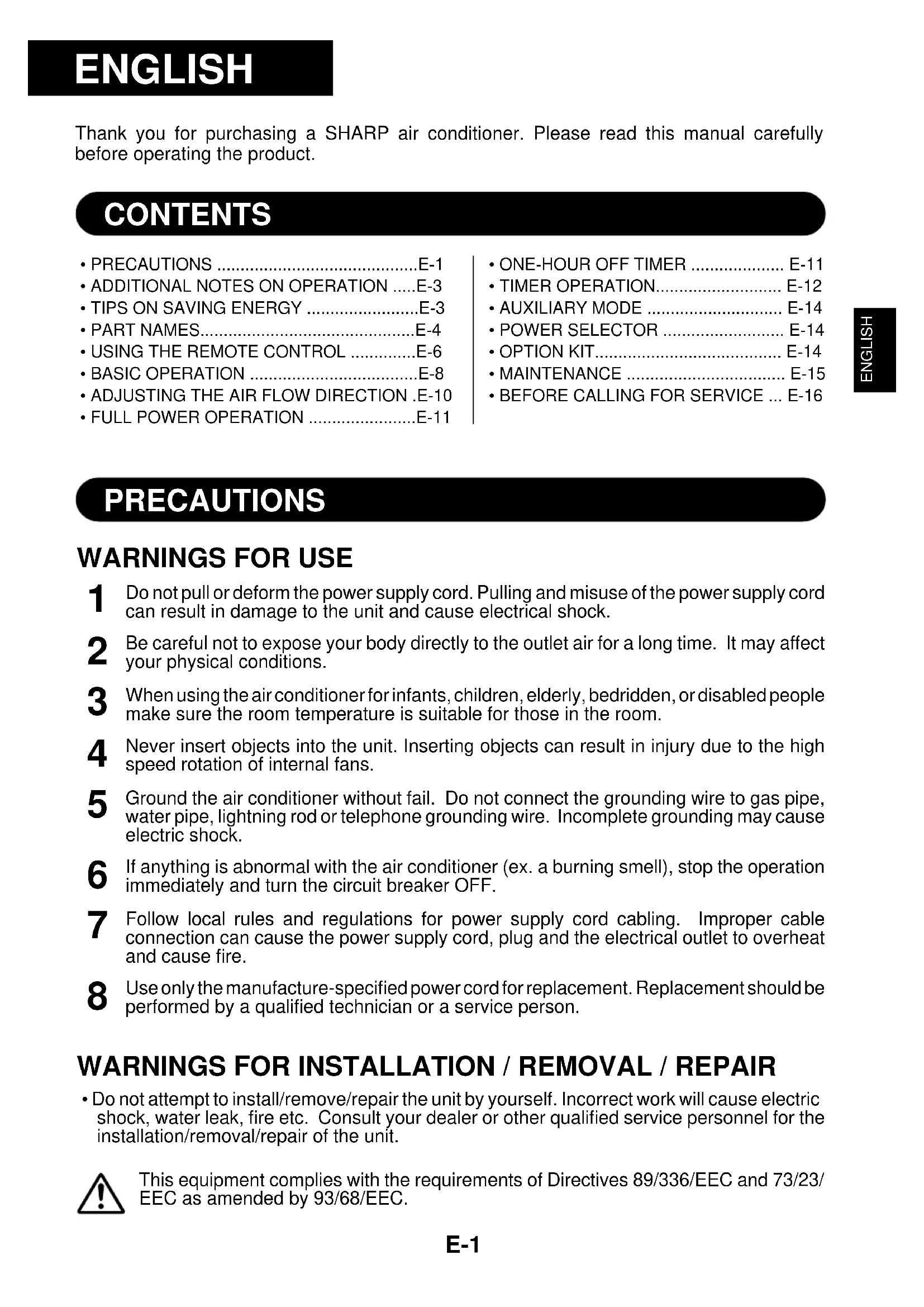 - Do not attempt to install/remove/repair the unit by yourself. Incorrect work will cause electricshock, water leak, fire etc. Consult your dealer or other qualified service personnel for theinstallation/removal/repair of the unit.This equipment complies with the requirements of Directives 89/336/EEC and 73/23/EEC as amended by 93/68/EEC.PRECAUTIONS