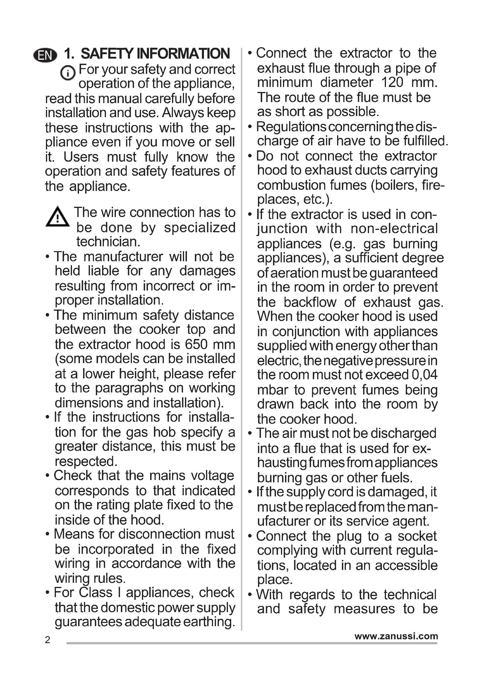 - With regards to the technical and safety measures to be EN3 www.zanussi.com adopted for fume discharging it is important to closely follow the regulations provided by the local authorities.