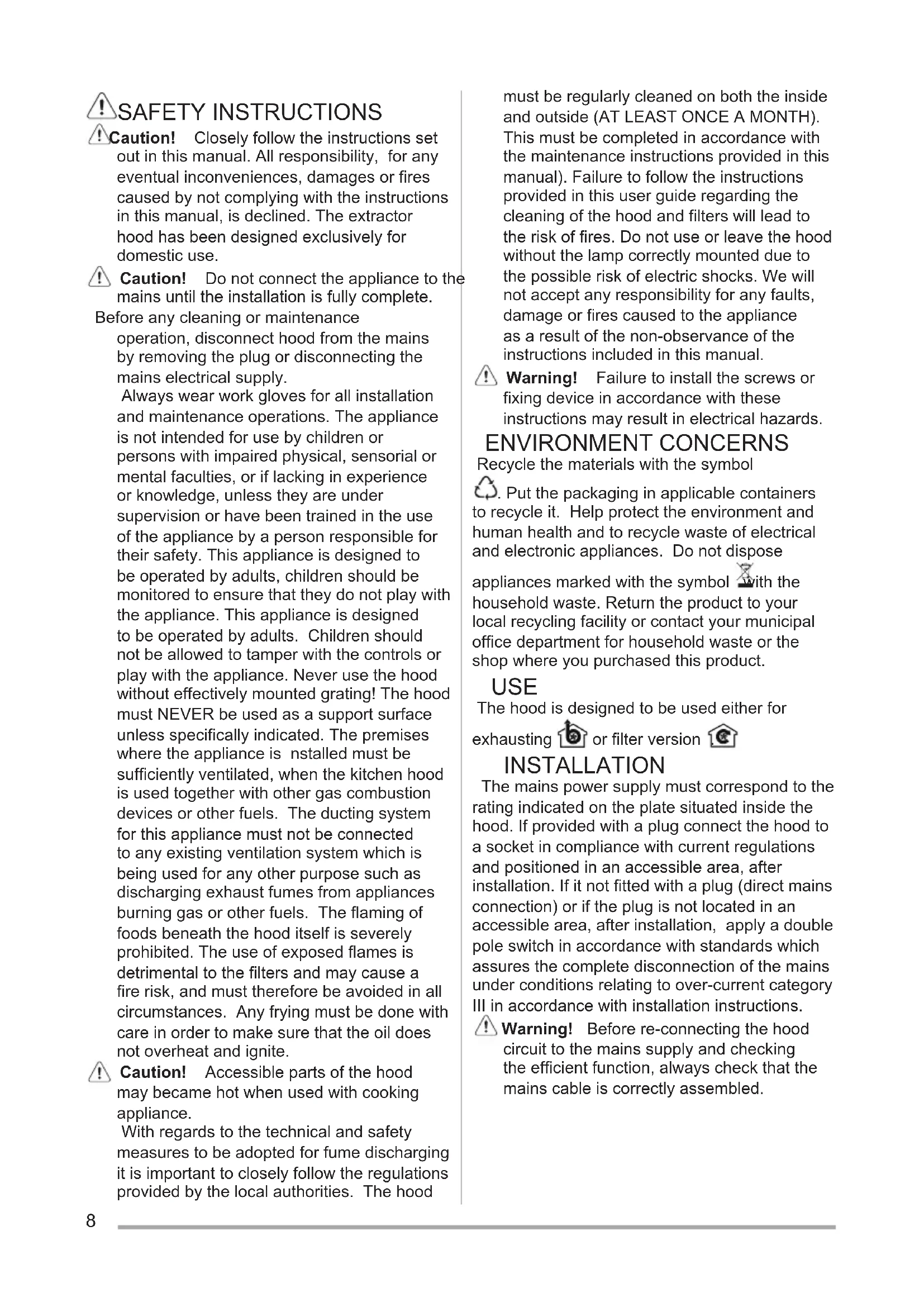 16.1-Type 208 SAFETY INSTRUCTIONS Caution! Closely follow the instructions set out in this manual. All responsibility, for any eventual inconveniences, damages or fires caused by not complying with the instructions in this manual, is declined. The extractor hood has been designed exclusively for domestic use. Caution! Do not connect the appliance to the mains until the installation is fully complete. Before any cleaning or maintenance operation, disconnect hood from the mains by removing the plug or disconnecting the mains electrical supply. Always wear work gloves for all installation and maintenance operations. The appliance is not intended for use by children or persons with impaired physical, sensorial or mental faculties, or if lacking in experience or knowledge, unless they are under supervision or have been trained in the use of the appliance by a person responsible for their safety. This appliance is designed to be operated by adults, children should be monitored to ensure that they do not play with the appliance. This appliance is designed to be operated by adults. Children should not be allowed to tamper with the controls or play with the appliance. Never use the hood without effectively mounted grating! The hood must NEVER be used as a support surface unless specifically indicated. The premises where the appliance is nstalled must be sufficiently ventilated, when the kitchen hood is used together with other gas combustion devices or other fuels. The ducting system for this appliance must not be connected to any existing ventilation system which is being used for any other purpose such as discharging exhaust fumes from appliances burning gas or other fuels. The flaming of foods beneath the hood itself is severely prohibited. The use of exposed flames is detrimental to the filters and may cause a fire risk, and must therefore be avoided in all circumstances. Any frying must be done with care in order to make sure that the oil does not overheat and ignite. Caution! Accessible parts of the hood may became hot when used with cooking appliance. With regards to the technical and safety measures to be adopted for fume discharging it is important to closely follow the regulations provided by the local authorities. The hood must be regularly cleaned on both the inside and outside (AT LEAST ONCE A MONTH). This must be completed in accordance with the maintenance instructions provided in this manual). Failure to follow the instructions provided in this user guide regarding the cleaning of the hood and filters will lead to the risk of fires. Do not use or leave the hood without the lamp correctly mounted due to the possible risk of electric shocks. We will not accept any responsibility for any faults, damage or fires caused to the appliance as a result of the non-observance of the instructions included in this manual. Warning! Failure to install the screws or fixing device in accordance with these instructions may result in electrical hazards. ENVIRONMENT CONCERNS Recycle the materials with the symbol . Put the packaging in applicable containers to recycle it. Help protect the environment and human health and to recycle waste of electrical and electronic appliances. Do not dispose appliances marked with the symbol with the household waste. Return the product to your local recycling facility or contact your municipal office department for household waste or the shop where you purchased this product. USE The hood is designed to be used either for exhausting or filter version . INSTALLATION The mains power supply must correspond to the rating indicated on the plate situated inside the hood. If provided with a plug connect the hood to a socket in compliance with current regulations and positioned in an accessible area, after installation. If it not fitted with a plug (direct mains connection) or if the plug is not located in an accessible area, after installation, apply a double pole switch in accordance with standards which assures the complete disconnection of the mains under conditions relating to over-current category III in accordance with installation instructions. Warning! Before re-connecting the hood circuit to the mains supply and checking the efficient function, always check that the mains cable is correctly assembled.9 The minimum distance between the supporting surface for the cooking equipment on the hob and the lowest part of the range hood must be not less than 50cm from electric cookers and 65cm from gas or mixed cookers. If the instructions for installation for the gas hob specify a greater distance, this must be adhered to. MAINTENANCE ATTENTION! Before performing any maintenance operation, isolate the hood from the electrical supply by switching off at the connector and removing the connector fuse. Or if the appliance has been connected through a plug and socket, then the plug must be removed from the socket. The cooker hood should be cleaned regularly (at least with the same frequency with which you carry out maintenance of the fat filters) internally and externally. Clean using the cloth dampened with neutral liquid detergent. Do not use abrasive products. DO NOT USE ALCOHOL! Warning! Failure to carry out the basic cleaning recommendations of the cooker hood and replacement of the filters may cause fire risks. Therefore, we recommend observing these instructions. The manufacturer declines all responsibility for any damage to the motor or any fire damage linked to inappropriate maintenance or failure to observe the above safety recommendations. Grease filter - The grease filter must be cleaned once a month using non aggressive detergents, either by hand or in the dishwasher, which must be set to a low temperature and a short cycle. When washed in a dishwasher, the grease filter may discolour slightly, but this does not affect its filtering capacity. Charcoal filter - Type 20 LONG LIFE - Wash- able activated charcoal filter The charcoal filter can be washed once every two m