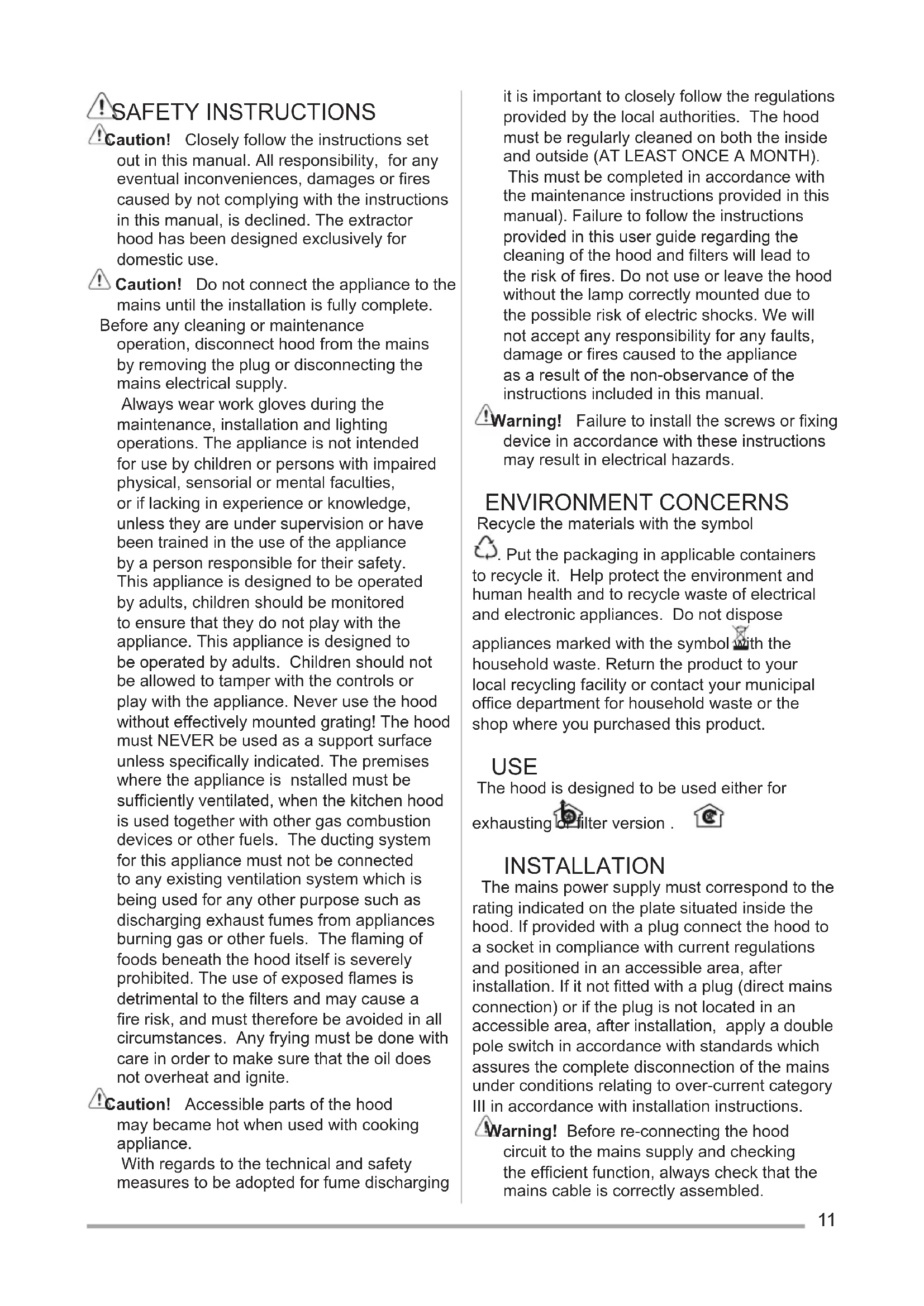 SAFETY INSTRUCTIONS Caution! Closely follow the instructions set out in this manual. All responsibility, for any eventual inconveniences, damages or fires caused by not complying with the instructions in this manual, is declined. The extractor hood has been designed exclusively for domestic use. Caution! Do not connect the appliance to the mains until the installation is fully complete. Before any cleaning or maintenance operation, disconnect hood from the mains by removing the plug or disconnecting the mains electrical supply. Always wear work gloves during the maintenance, installation and lighting operations. The appliance is not intended for use by children or persons with impaired physical, sensorial or mental faculties, or if lacking in experience or knowledge, unless they are under supervision or have been trained in the use of the appliance by a person responsible for their safety. This appliance is designed to be operated by adults, children should be monitored to ensure that they do not play with the appliance. This appliance is designed to be operated by adults. Children should not be allowed to tamper with the controls or play with the appliance. Never use the hood without effectively mounted grating! The hood must NEVER be used as a support surface unless specifically indicated. The premises where the appliance is nstalled must be sufficiently ventilated, when the kitchen hood is used together with other gas combustion devices or other fuels. The ducting system for this appliance must not be connected to any existing ventilation system which is being used for any other purpose such as discharging exhaust fumes from appliances burning gas or other fuels. The flaming of foods beneath the hood itself is severely prohibited. The use of exposed flames is detrimental to the filters and may cause a fire risk, and must therefore be avoided in all circumstances. Any frying must be done with care in order to make sure that the oil does not overheat and ignite. Caution! Accessible parts of the hood may became hot when used with cooking appliance. With regards to the technical and safety measures to be adopted for fume discharging it is important to closely follow the regulations provided by the local authorities. The hood must be regularly cleaned on both the inside and outside (AT LEAST ONCE A MONTH). This must be completed in accordance with the maintenance instructions provided in this manual). Failure to follow the instructions provided in this user guide regarding the cleaning of the hood and filters will lead to the risk of fires. Do not use or leave the hood without the lamp correctly mounted due to the possible risk of electric shocks. We will not accept any responsibility for any faults, damage or fires caused to the appliance as a result of the non-observance of the instructions included in this manual. Warning! Failure to install the screws or fixing device in accordance with these instructions may result in electrical hazards. ENVIRONMENT CONCERNS Recycle the materials with the symbol . Put the packaging in applicable containers to recycle it. Help protect the environment and human health and to recycle waste of electrical and electronic appliances. Do not dispose appliances marked with the symbol with the household waste. Return the product to your local recycling facility or contact your municipal office department for household waste or the shop where you purchased this product. USE The hood is designed to be used either for exhausting or filter version . INSTALLATION The mains power supply must correspond to the rating indicated on the plate situated inside the hood. If provided with a plug connect the hood to a socket in compliance with current regulations and positioned in an accessible area, after installation. If it not fitted with a plug (direct mains connection) or if the plug is not located in an accessible area, after installation, apply a double pole switch in accordance with standards which assures the complete disconnection of the mains under conditions relating to over-current category III in accordance with installation instructions. Warning! Before re-connecting the hood circuit to the mains supply and checking the efficient function, always check that the mains cable is correctly assembled.12 The minimum distance between the supporting surface for the cooking equipment on the hob and the lowest part of the range hood must be not less than 43cm from electric cookers and 65cm from gas or mixed cookers. If the instructions for installation for the gas hob specify a greater distance, this must be adhered to. MAINTENANCE ATTENTION! Before performing any maintenance operation, isolate the hood from the electrical supply by switching off at the connector and removing the connector fuse. Or if the appliance has been connected through a plug and socket, then the plug must be removed from the socket. The cooker hood should be cleaned regularly (at least with the same frequency with which you carry out maintenance of the fat filters) internally and externally. Clean using the cloth dampened with neutral liquid detergent. Do not use abrasive products. DO NOT USE ALCOHOL! Warning! Failure to carry out the basic cleaning recommendations of the cooker hood and replacement of the filters may cause fire risks. Therefore, we recommend observing these instructions. The manufacturer declines all responsibility for any damage to the motor or any fire damage linked to inappropriate maintenance or failure to observe the above safety recommendations. Grease filter - The grease filter must be cleaned once a month using non aggressive detergents, either by hand or in the dishwasher, which must be set to a low temperature and a short cycle. When washed in a dishwasher, the grease filter may discolour slightly, but this does not affect its filtering capacity. NON-washable activated charcoal filter The saturation of the charcoal filter occurs after more or less prolonged use, dependi