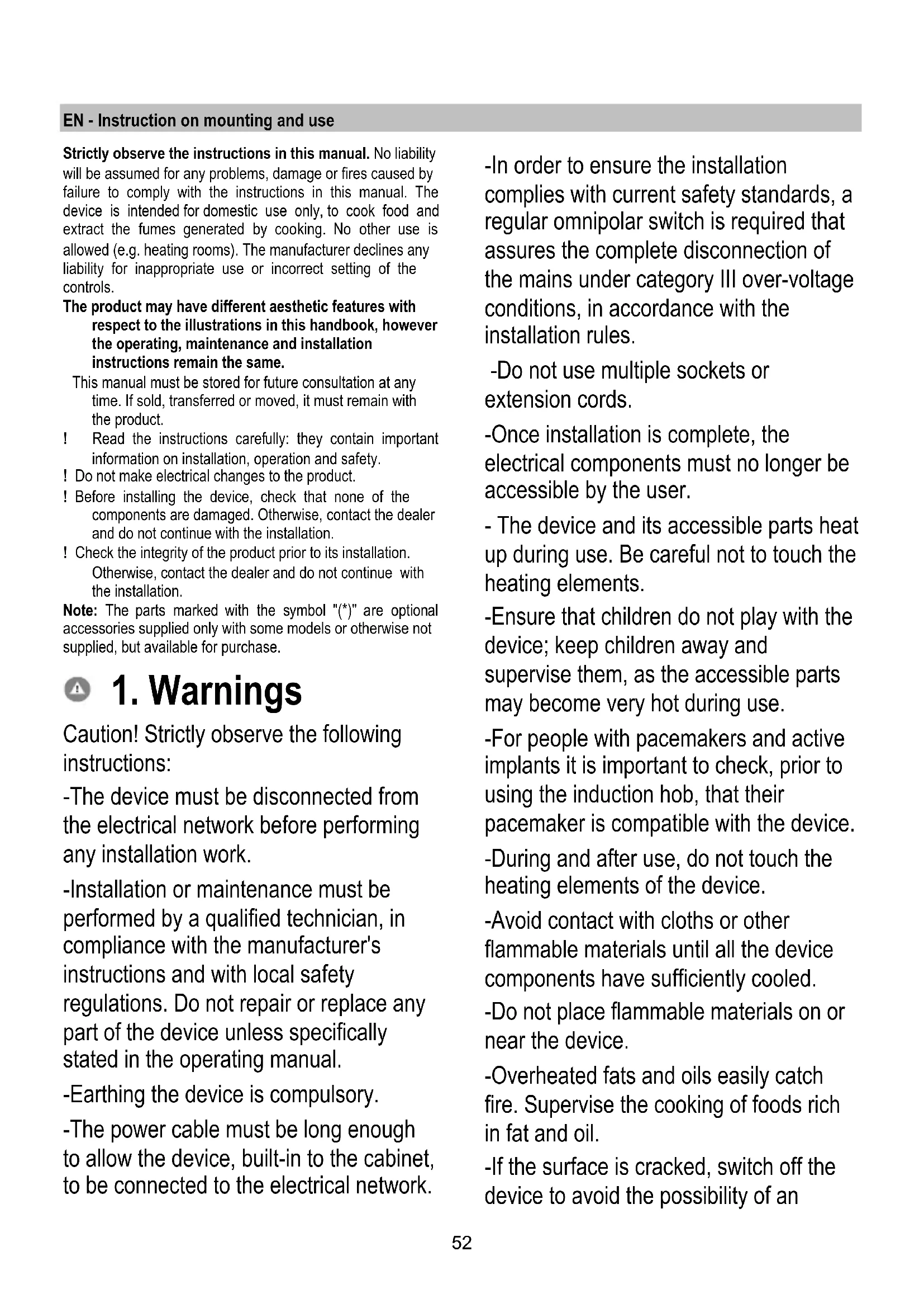 1,85 kw 3,7 kw Ø 220mm 19OK! OK! NO! NO! NO! OK! NO! !52 EN - Instruction on mounting and use Strictly observe the instructions in this manual. No liability will be assumed for any problems, damage or fires caused by failure to comply with the instructions in this manual. The device is intended for domestic use only, to cook food and extract the fumes generated by cooking. No other use is allowed (e.g. heating rooms). The manufacturer declines any liability for inappropriate use or incorrect setting of the controls. The product may have different aesthetic features with respect to the illustrations in this handbook, however the operating, maintenance and installation instructions remain the same. This manual must be stored for future consultation at any time. If sold, transferred or moved, it must remain with the product. ! Read the instructions carefully: they contain important information on installation, operation and safety. ! Do not make electrical changes to the product. ! Before installing the device, check that none of the components are damaged. Otherwise, contact the dealer and do not continue with the installation. ! Check the integrity of the product prior to its installation. Otherwise, contact the dealer and do not continue with the installation. Note: The parts marked with the symbol "(*)" are optional accessories supplied only with some models or otherwise not supplied, but available for purchase.
