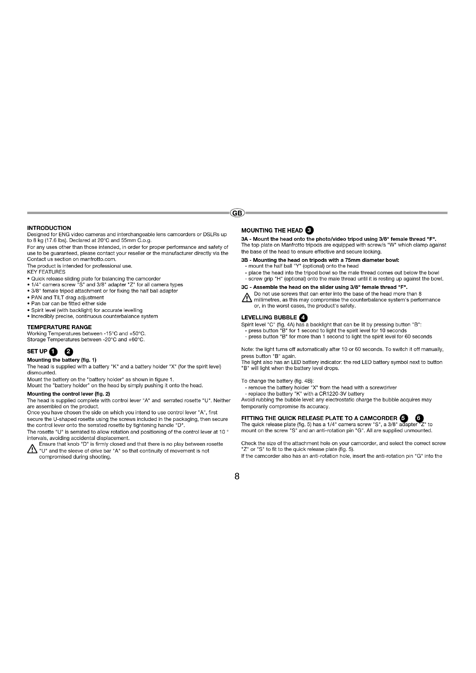 The quick release plate (fig. 5) has a 1/4^ camera screw "S", a 3/8^ adapter "Z" to mount on the screw "S" and an anti-rotation pin "G". All are supplied unmounted.