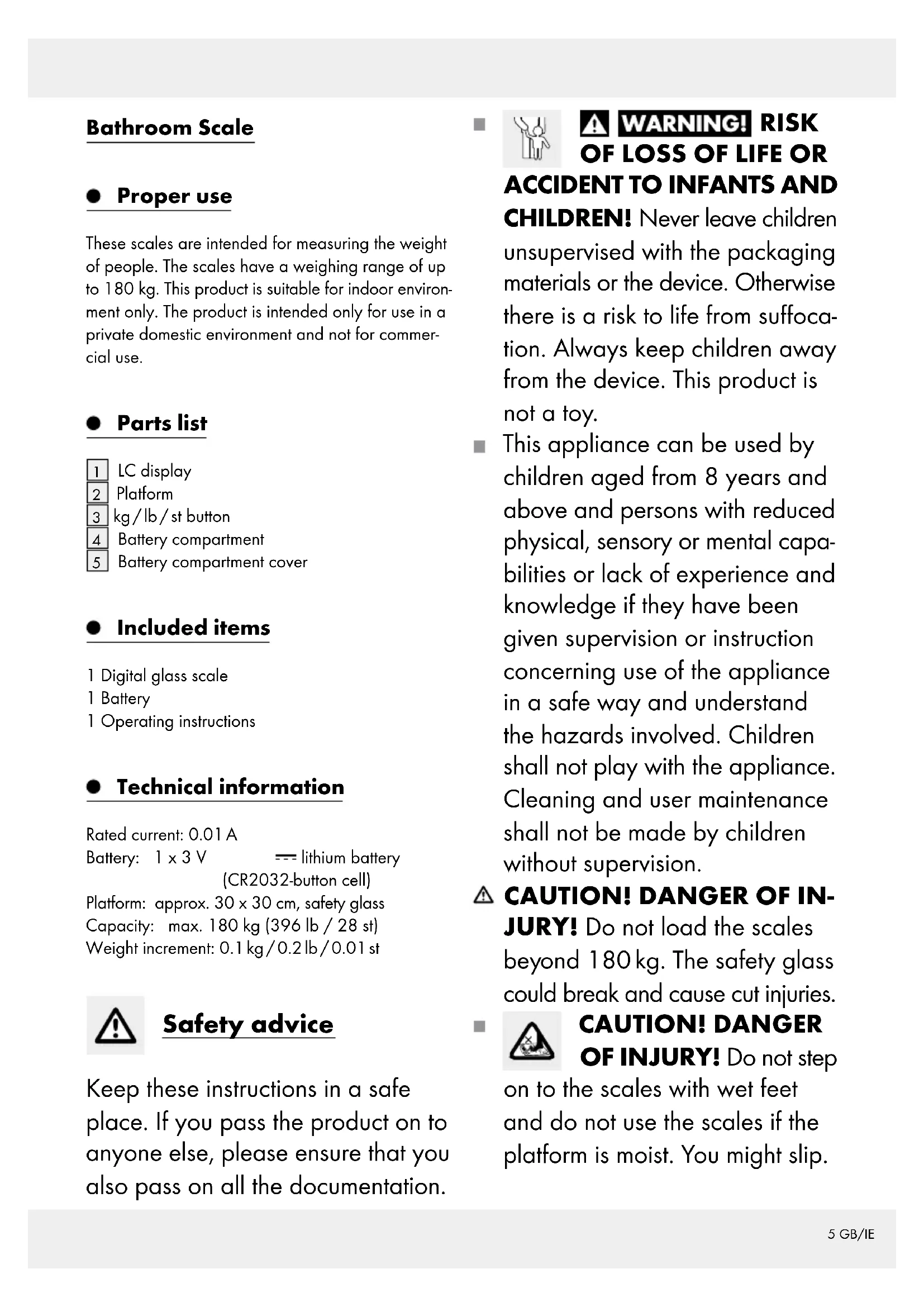 JURY! Do not load the scales beyond 180 kg. The safety glass could break and cause cut injuries. CAUTION! DANGER OF INJURY! Do not step on to the scales with wet feet and do not use the scales if the platform is moist. You might slip.6 GB/IE Protect your scales from impact, moisture, dust, chemicals and sudden changes in temperature and keep them away from sources of heat (ovens, heating radiators). Check the device for damage before bringing it into use. If the device is damaged do not use it. Remove the battery if the device breaks down or is defective. Otherwise the battery is more likely to leak. Always have any repairs carried out at the service centre or by an electrical equipment repair specialist. Dangers arising from the use of batteries DANGER TO LIFE! Batteries are not intended to be in the hands of children. Do not leave batteries lying around. They could be swallowed by children or pets. In the event of swallowing a battery, contact a doctor immediately! CAUTION! DANGER OF EXPLOSION! Never recharge single-use batteries. Do not short-circuit or open them. Overheating, fire or destruction of the batteries might result. Never throw batteries into fire or water. The batteries might explode. Avoid extreme environmental conditions and temperatures as they may affect batteries e.g. above radiators. Otherwise the batteries are more likely to leak. Exhausted or damaged batteries can cause caustic burns upon contact with the skin. To avoid this, always wear suitable protective gloves in these circum- stances! Avoid contact with the skin, eyes and mucous membranes if fluid is leaking from a battery. If you come into contact with corrosive battery fluids, flush the affected area thoroughly with clean water and contact a doctor immediately. Remove the battery if you are not going to use the device for an extended period. When inserting the battery, ensure the correct polarity! This is shown in the battery compartment. Remove a spent battery immedi- ately from the device. There is an increased danger of leaks! Batteries must not be disposed of in the normal domestic waste!7 GB/IE Every consumer is legally obliged to dispose of batteries in the proper manner! Keep batteries away from children; do not throw batteries in the fire, short-circuit them or take them apart. If the above instructions are not complied with, the battery may discharge itself beyond its end voltage. There is then a danger of leaking. If the battery has leaked inside your device, you should remove it immediately in order to prevent damage to the device! Before first use Removing the insulation strips Note: The product is supplied with the battery already in place. Before first use pull the insulation strip out from between the battery and the battery compartment. Preparing for use Inserting the battery See Fig.