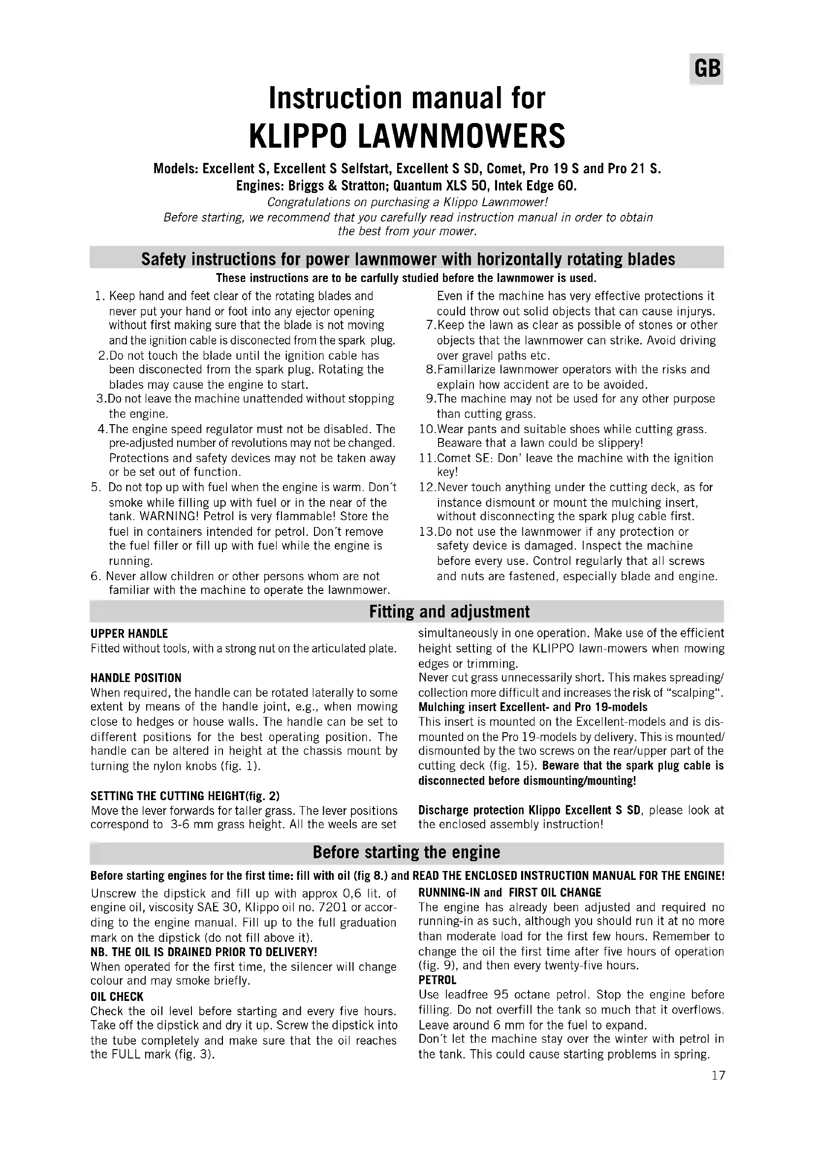 Instruction manual for KLIPPO LAWNMOWERS Models: Excellent S, Excellent S Selfstart, Excellent S SD, Comet, Pro 19 S and Pro 21 S. Engines: Briggs & Stratton; Quantum XLS 50, Intek Edge 60. Congratulations on purchasing a Klippo Lawnmower!Before starting, we recommend that you carefully read instruction manual in order to obtainthe best from your mower. Keep hand and feet clear of the rotating blades andnever put your hand or foot into any ejector openingwithout first making sure that the blade is not movingand the ignition cable is disconected from the spark plug. 2.Do not touch the blade until the ignition cable hasbeen disconected from the spark plug. Rotating theblades may cause the engine to start. 3.Do not leave the machine unattended without stoppingthe engine. 4.The engine speed regulator must not be disabled. Thepre-adjusted number of revolutions may not be changed.Protections and safety devices may not be taken awayor be set out of function.5. Do not top up with fuel when the engine is warm. Don´tsmoke while filling up with fuel or in the near of thetank. WARNING! Petrol is very flammable! Store thefuel in containers intended for petrol. Don´t removethe fuel filler or fill up with fuel while the engine isrunning.6. Never allow children or other persons whom are notfamiliar with the machine to operate the lawnmower.These instructions are to be carfully studied before the lawnmower is used.Unscrew the dipstick and fill up with approx 0,6 lit. ofengine oil, viscosity SAE 30, Klippo oil no. 7201 or accor-ding to the engine manual. Fill up to the full graduationmark on the dipstick (do not fill above it).NB. THE OIL IS DRAINED PRIOR TO DELIVERY!When operated for the first time, the silencer will changecolour and may smoke briefly.OIL CHECKCheck the oil level before starting and every five hours.Take off the dipstick and dry it up. Screw the dipstick intothe tube completely and make sure that the oil reachesthe FULL mark (fig. 3). Before starting engines for the first time: fill with oil (fig 8.) and READ THE ENCLOSED INSTRUCTION MANUAL FOR THE ENGINE! Safety instructions for power lawnmower with horizontally rotating blades Fitting and adjustment Before starting the engine Even if the machine has very effective protections itcould throw out solid objects that can cause injurys. 7.Keep the lawn as clear as possible of stones or otherobjects that the lawnmower can strike. Avoid drivingover gravel paths etc. 8.Famillarize lawnmower operators with the risks andexplain how accident are to be avoided. 9.The machine may not be used for any other purposethan cutting grass.10.Wear pants and suitable shoes while cutting grass.Beaware that a lawn could be slippery!11.Comet SE: Don’ leave the machine with the ignition key! 12.Never touch anything under the cutting deck, as forinstance dismount or mount the mulching insert,without disconnecting the spark plug cable first.13.Do not use the lawnmower if any protection orsafety device is damaged. Inspect the machinebefore every use. Control regularly that all screwsand nuts are fastened, especially blade and engine.UPPER HANDLEFitted without tools, with a strong nut on the articulated plate.HANDLE POSITIONWhen required, the handle can be rotated laterally to someextent by means of the handle joint, e.g., when mowingclose to hedges or house walls. The handle can be set todifferent positions for the best operating position. Thehandle can be altered in height at the chassis mount byturning the nylon knobs (fig. 1).SETTING THE CUTTING HEIGHT(fig. 2)Move the lever forwards for taller grass. The lever positionscorrespond to 3-6 mm grass height. All the weels are setsimultaneously in one operation. Make use of the efficientheight setting of the KLIPPO lawn-mowers when mowingedges or trimming.Never cut grass unnecessarily short. This makes spreading/collection more difficult and increases the risk of “scalping“.Mulching insert Excellent- and Pro 19-modelsThis insert is mounted on the Excellent-models and is dis-mounted on the Pro 19-models by delivery. This is mounted/dismounted by the two screws on the rear/upper part of thecutting deck (fig. 15). Beware that the spark plug cable isdisconnected before dismounting/mounting! Discharge protection Klippo Excellent S SD, please look at the enclosed assembly instruction!RUNNING-IN and FIRST OIL CHANGEThe engine has already been adjusted and required norunning-in as such, although you should run it at no morethan moderate load for the first few hours. Remember tochange the oil the first time after five hours of operation(fig. 9), and then every twenty-five hours.PETROLUse leadfree 95 octane petrol. Stop the engine beforefilling. Do not overfill the tank so much that it overflows.Leave around 6 mm for the fuel to expand.Don´t let the machine stay over the winter with petrol inthe tank. This could cause starting problems in spring.18 Starting the engine ELECTRIC STARTER (fig. 12) (before starting for the first time, connect the battery cable, fig. 13) Follow the starting instructions above according to point 1 and 2 then turn the ignition key on the handle clockwise. Hold the key in this position until the engine starts, re- lease it when it has done so and move the controls to the operating position. STOP COMET is stopped by dropping the security bail (fig. 5b), the engine stops and the drive will be disengaged, or through moving the drive-control (fig. 5c) to stop (backwards-upwards). The engine will then be running but the drive is disengaged. To engage the drive again - move the drive-control forwards-down-wards. Excellent S, Pro 19 S and Pro 21 S is stopped by dropping the safety bail (fig. 5b). If you just want to stop the trans- mission while the engine is running, drop the safety bail just a little bit until the transmission control is dropping. To engage the transmission again, push the transmission control forwards (fig. 5c). General remarks Maintenance