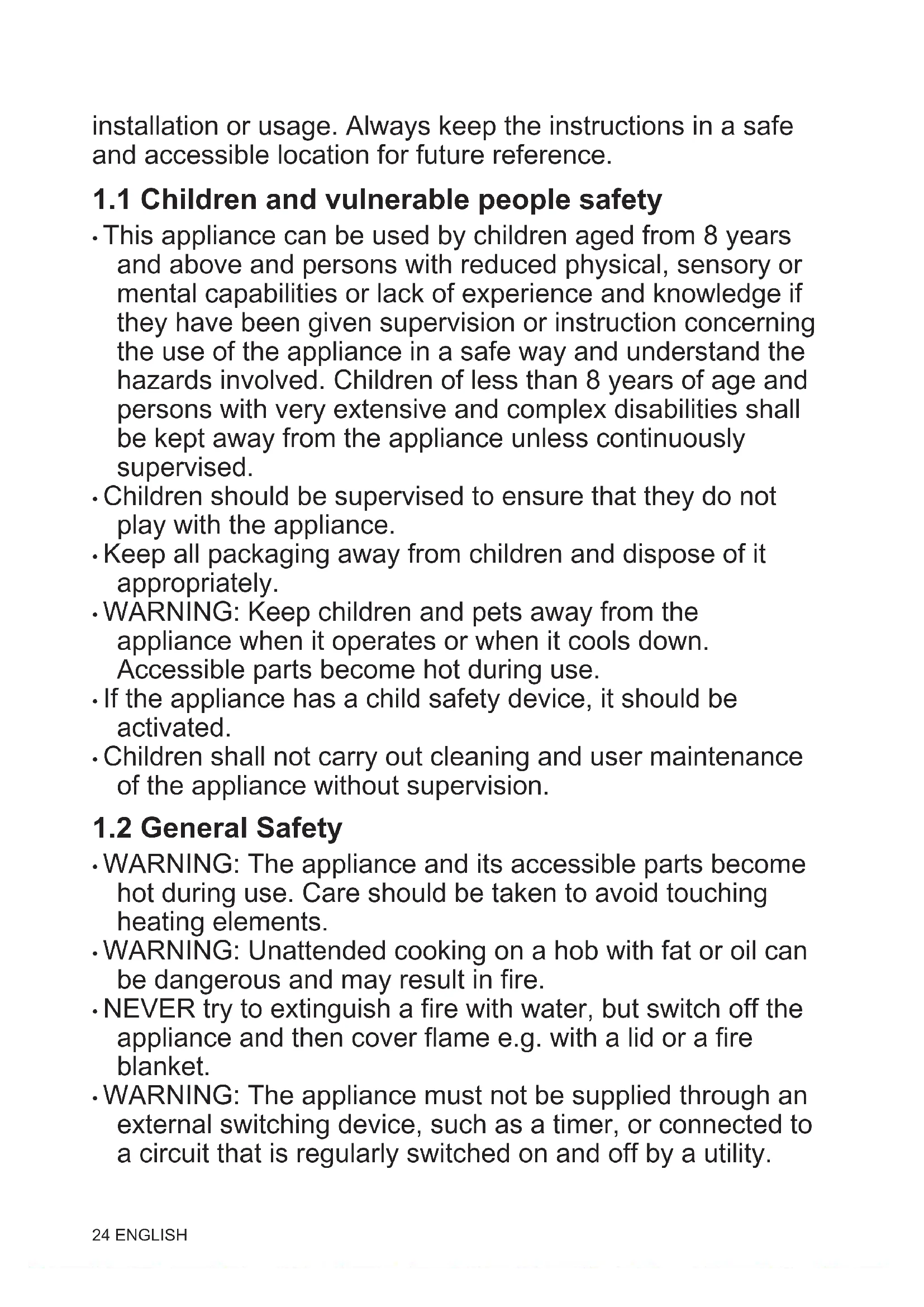 - WARNING: The appliance must not be supplied through an external switching device, such as a timer, or connected to a circuit that is regularly switched on and off by a utility. 24 ENGLISH• CAUTION: The cooking process has to be supervised. A short term cooking process has to be supervised continuously.
