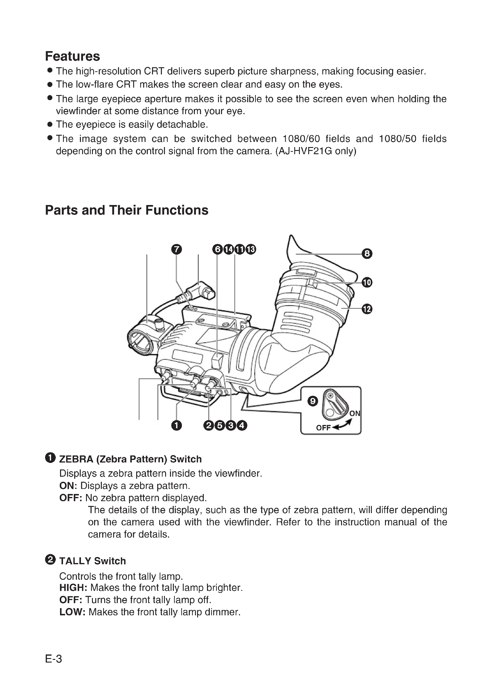 01.21G/27G英(17)06.4.611:50ページ3E-4 ENGLISH Lights when the camera is shooting and the TALLY switch is set to HIGH or LOW. Also, flashes on and off as a warning indication, in the same manner as the REC lamp, inside the viewfinder. The brightness of the front tally lamp is controlled by the setting of the TALLY switch (HIGH or LOW). Front Tally Lamp