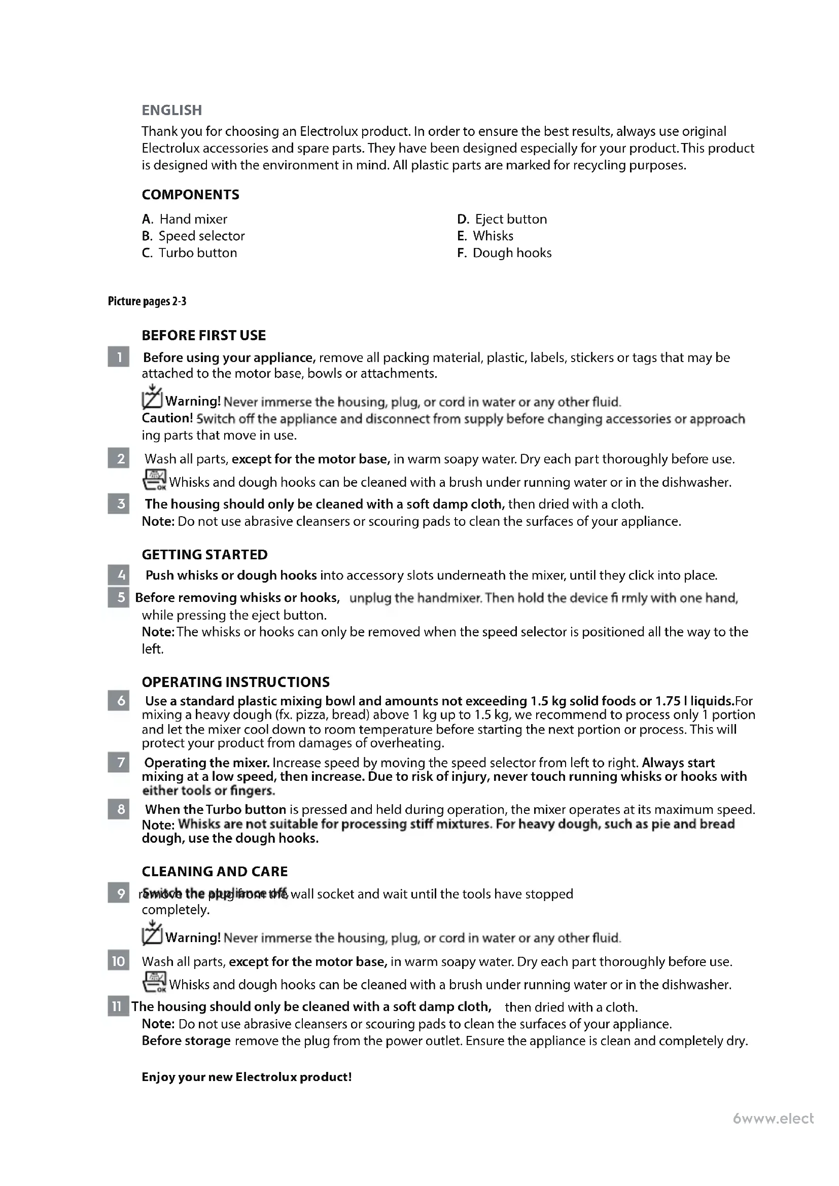 When contacting Service, ensure that you have the following data available: - Model Number - PNC number - Serial number The information can be found on the rating plate.5www.electrolux.com6www.electrolux.com ENGLISH Thank you for choosing an Electrolux product. In order to ensure the best results, always use original Electrolux accessories and spare parts. They have been designed especially for your product. This product is designed with the environment in mind. All plastic parts are marked for recycling purposes. COMPONENTS A. Hand mixer B. Speed selector C. Turbo button D. Eject button E. Whisks F. Dough hooks Picture pages 2-3