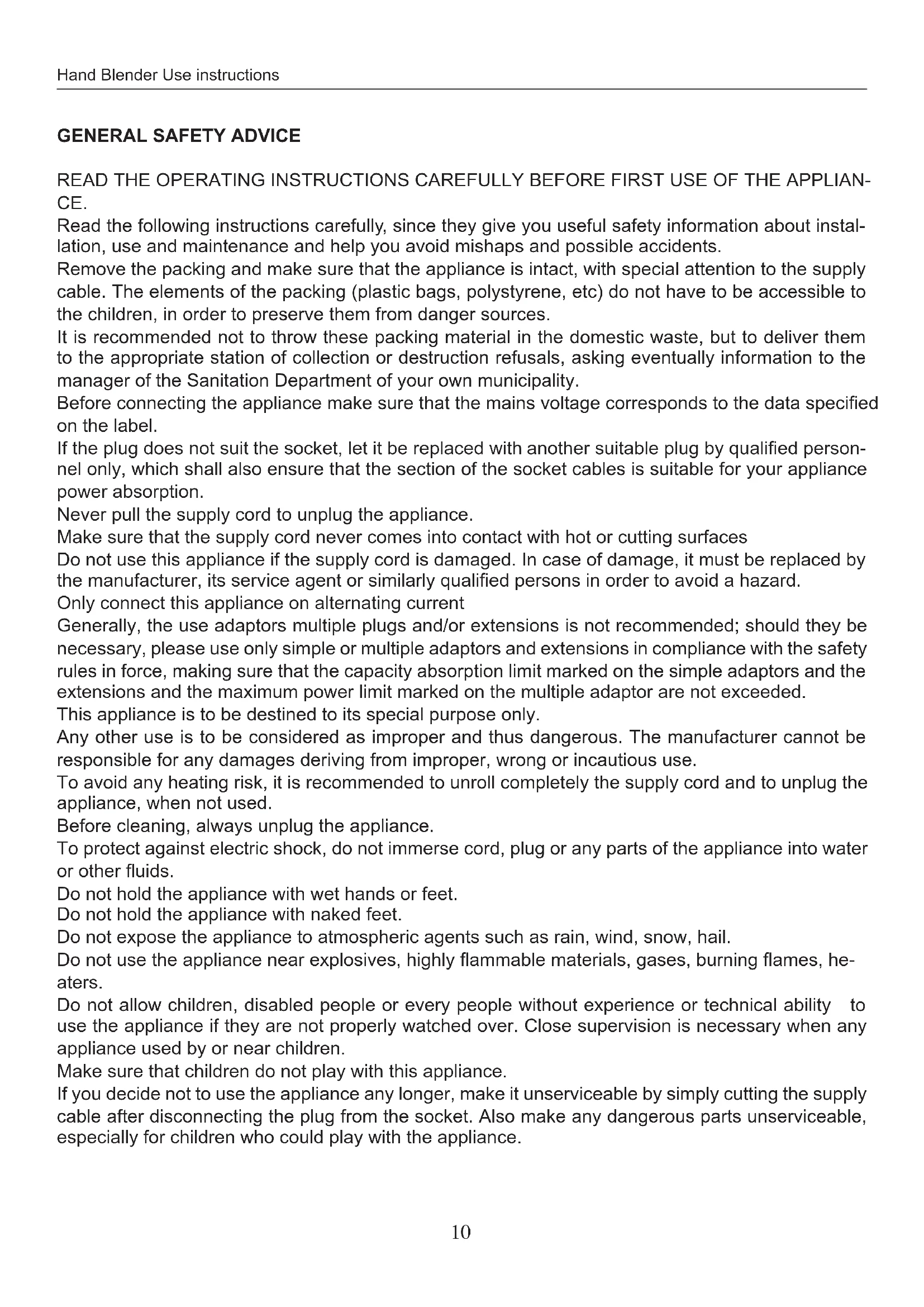 Before using the hand blender check the integrity of the appliance and cord supply.