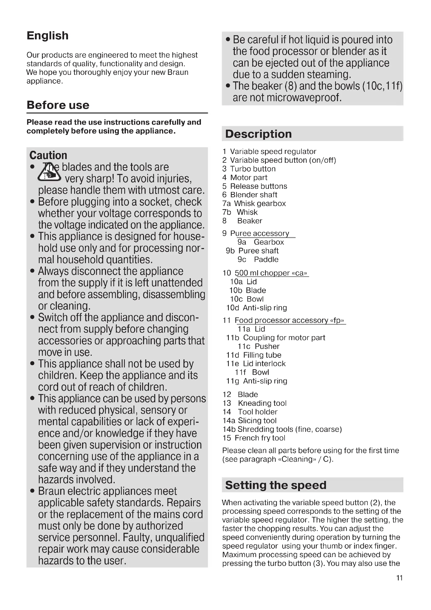 - Resume mashing for about 30s Cleaning (C) Clean the motor part (4), the gear boxes (7a,9a) with a damp cloth only. The lids can be cleaned under running water but do not immerse them in water, nor clean it in a dishwasher. All other parts can be cleaned in a dishwasher. If food has been allowed to dry onto the puree accessory, remove the paddle. Soak the paddle and bottom of the puree accessory shaft in warm water to soften and then wash thoroughly. You may remove the anti-slip rings from the chopper bowls for extra thorough cleaning. When processing foods with a high pigment content (e.g. carrots), the plastic parts of the appliance may become discoloured. Wipe these parts with vegetable oil before cleaning them. Accessories (can be bought individually, not available in every country) MQ 10: Whisk for whipping cream, beating egg whites MQ 20: 350 ml chopper to chop herbs, carrots, etc. MQ 30: 500 ml chopper to chop carrots, meat, onions, etc. MQ 40: 1250 ml chopper to chop, mix, blend and crush ice MQ 50: puree accessory to puree cooked vegatable and potatoes MQ 70: food processor accessory for chopping, blending, kneading and shredding Subject to change without notice. Please do not dispose of the product in the household waste at the end of its useful life. Disposal can take place at a Braun Service Centre or at appropriate collection points provided in your country. For UK Only Guarantee Information All Braun Household products carry a minimum guarantee period of two year. The rights and benefits under this guarantee are additional to your statutory rights which are not affected. Please keep your receipt as this will form the basis of your guarantee. In the unlikely event of a breakdown you have access to professional help from our team simply by calling: