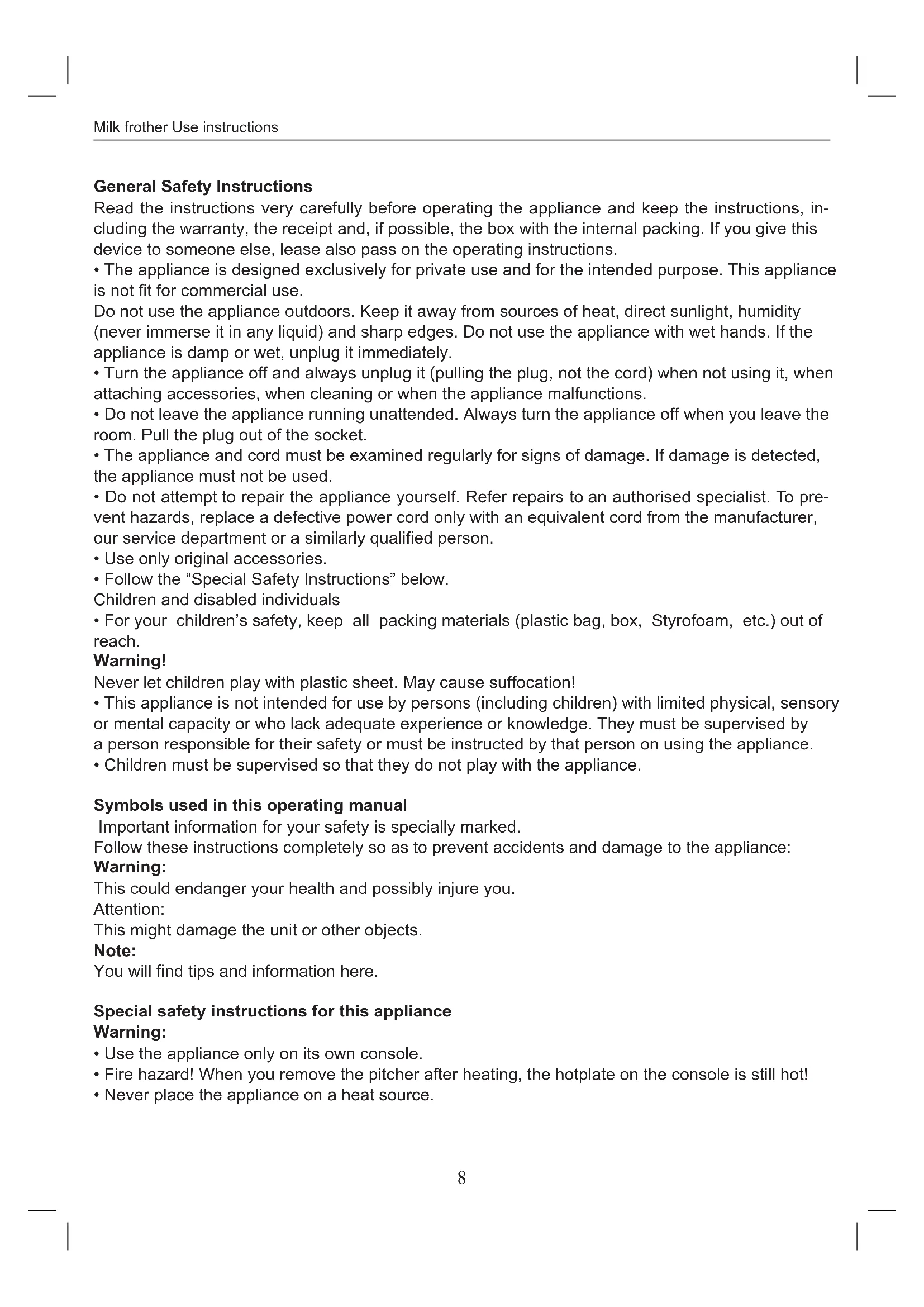 Read the instructions very carefully before operating the appliance and keep the instructions, including the warranty, the receipt and, if possible, the box with the internal packing. If you give this device to someone else, lease also pass on the operating instructions.