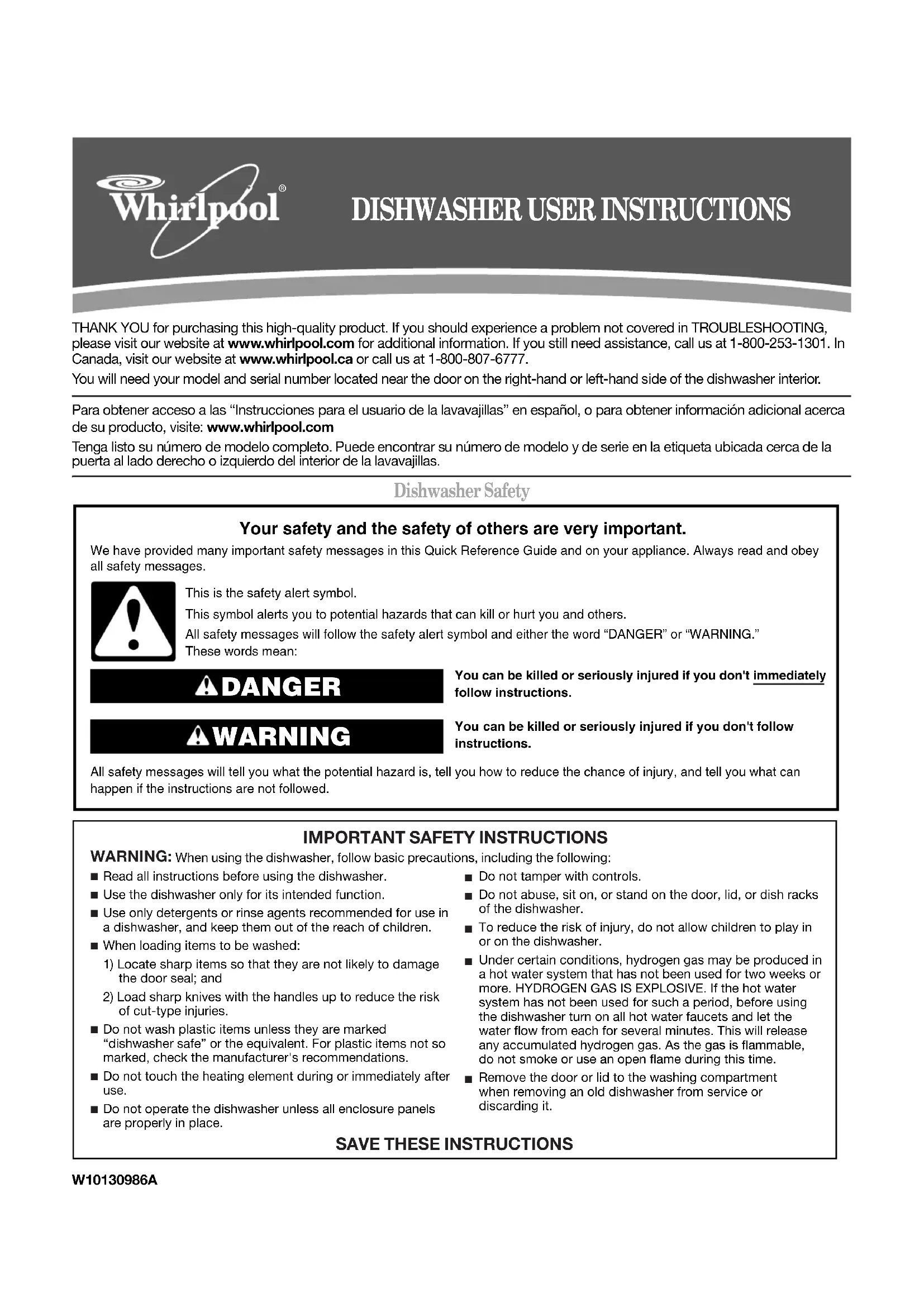 Do not operate the dishwasher unless all enclosure panels are properly in place. Do not tamper with controls. Do not abuse, sit on, or stand on the door, lid, or dish racks of the dishwasher. To reduce the risk of injury, do not allow children to play in or on the dishwasher. Under certain conditions, hydrogen gas may be produced in a hot water system that has not been used for two weeks or more. HYDROGEN GAS IS EXPLOSIVE. If the hot water system has not been used for such a period, before using the dishwasher turn on all hot water faucets and let the water flow from each for several minutes. This will release any accumulated hydrogen gas. As the gas is flammable, do not smoke or use an open flame during this time. Remove the door or lid to the washing compartment when removing an old dishwasher from service or discarding it.W10130986A2 Quick Steps Dishwasher Use Prepare and Load the DishwasherIMPORTANT: Remove leftover food, bones, toothpicks and other hard items from the dishes. Remove labels from containers before washing. ■ Make sure that when the dishwasher door is closed no items are blocking the detergent dispenser.■ Items should be loaded with soiled surfaces facing down and inward to the spray as shown. This will improve cleaning and drying results. ■ Avoid overlapping items like bowls or plates that may trap food. ■ Place plastics, small plates and glasses in the upper rack. Wash only plastic items marked “dishwasher safe.” ■ To avoid thumping/clattering noises during operation: Load dishes so they do not touch one another. Make sure lightweight load items are secured in the racks. Prepare and load dishwasher. Select a cycle and option. Add detergent for cleaning and rinse aid for drying. Start dishwasher. GROUNDING INSTRUCTIONS