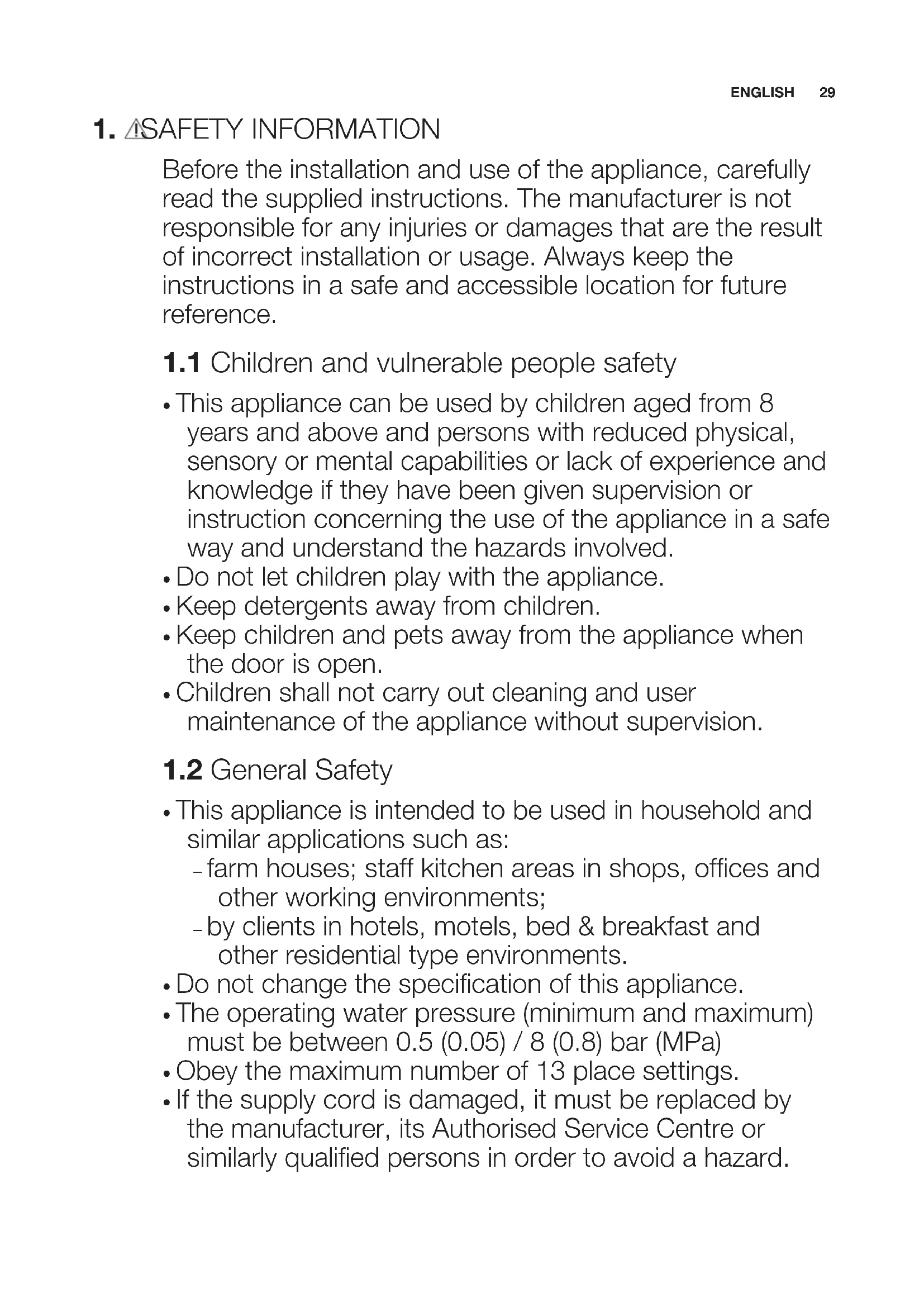 - If the supply cord is damaged, it must be replaced by the manufacturer, its Authorised Service Centre or similarly qualified persons in order to avoid a hazard. ENGLISH 29• Put the cutlery in the cutlery basket with the sharp ends pointing down or put them in the cutlery drawer in a horizontal position with the sharp edges down.