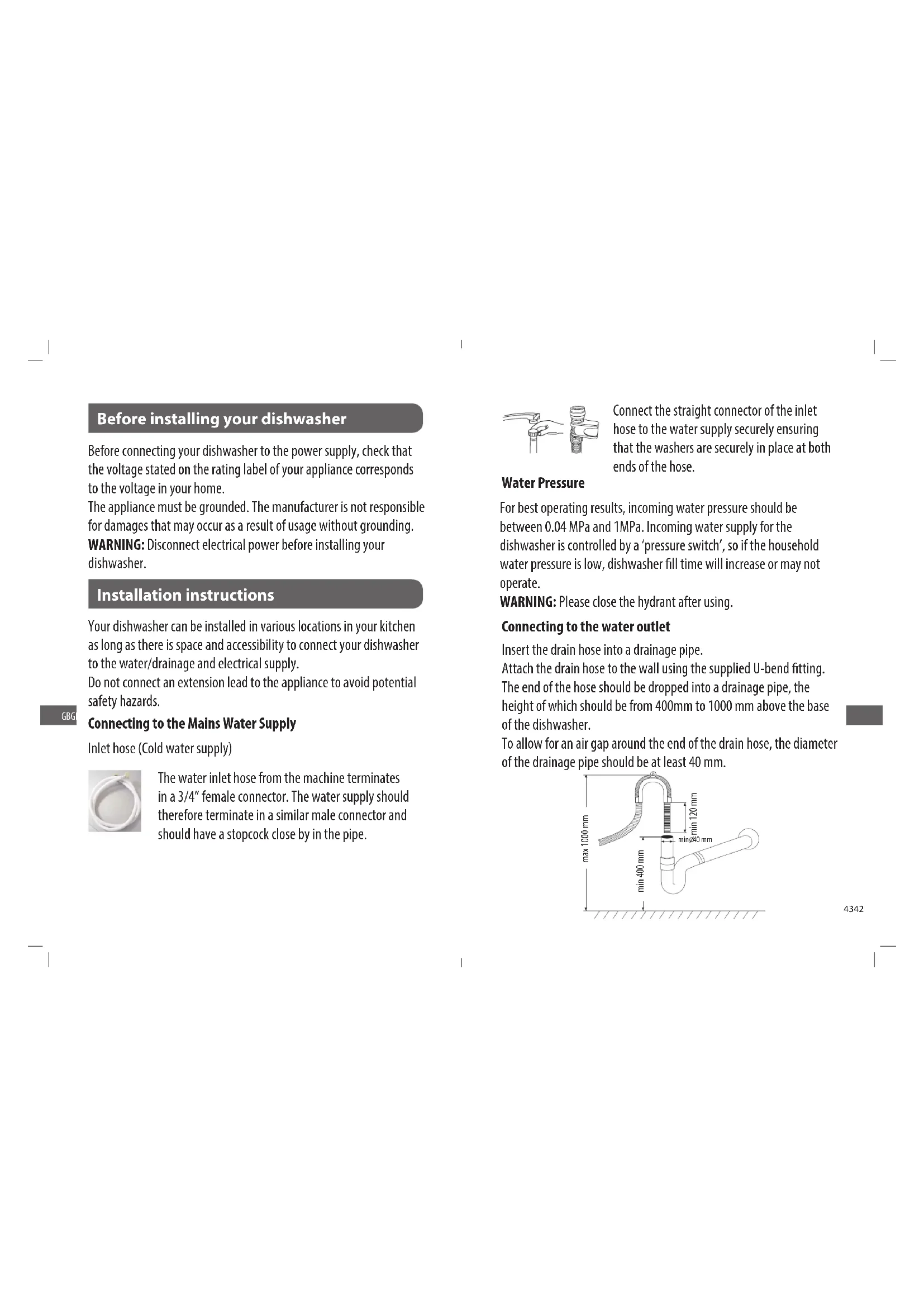 GB GB For best operating results, incoming water pressure should be between 004 MPa and 1MPa Incoming water supply for the dishwasher is controlled by a ‘pressure switch’, so if the household water pressure is low, dishwasher ll time will increase or may not operate