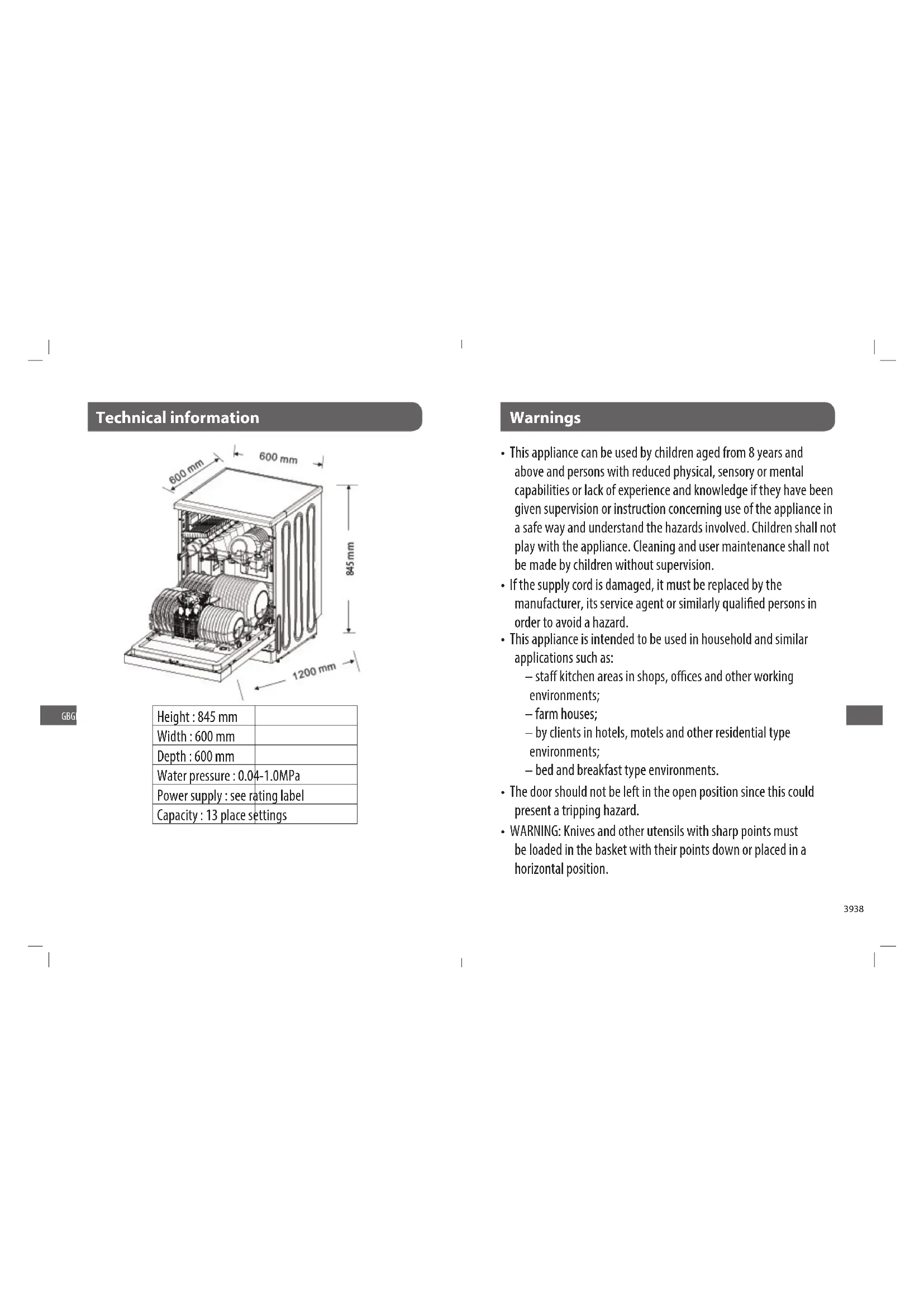 - The door should not be left in the open position since this could present a tripping hazard• The ventilation openings must not be obstructed by a carpet The maximum number of place settings to be washed: 13 The inlet water pressure is 0,04-1 MPa Description