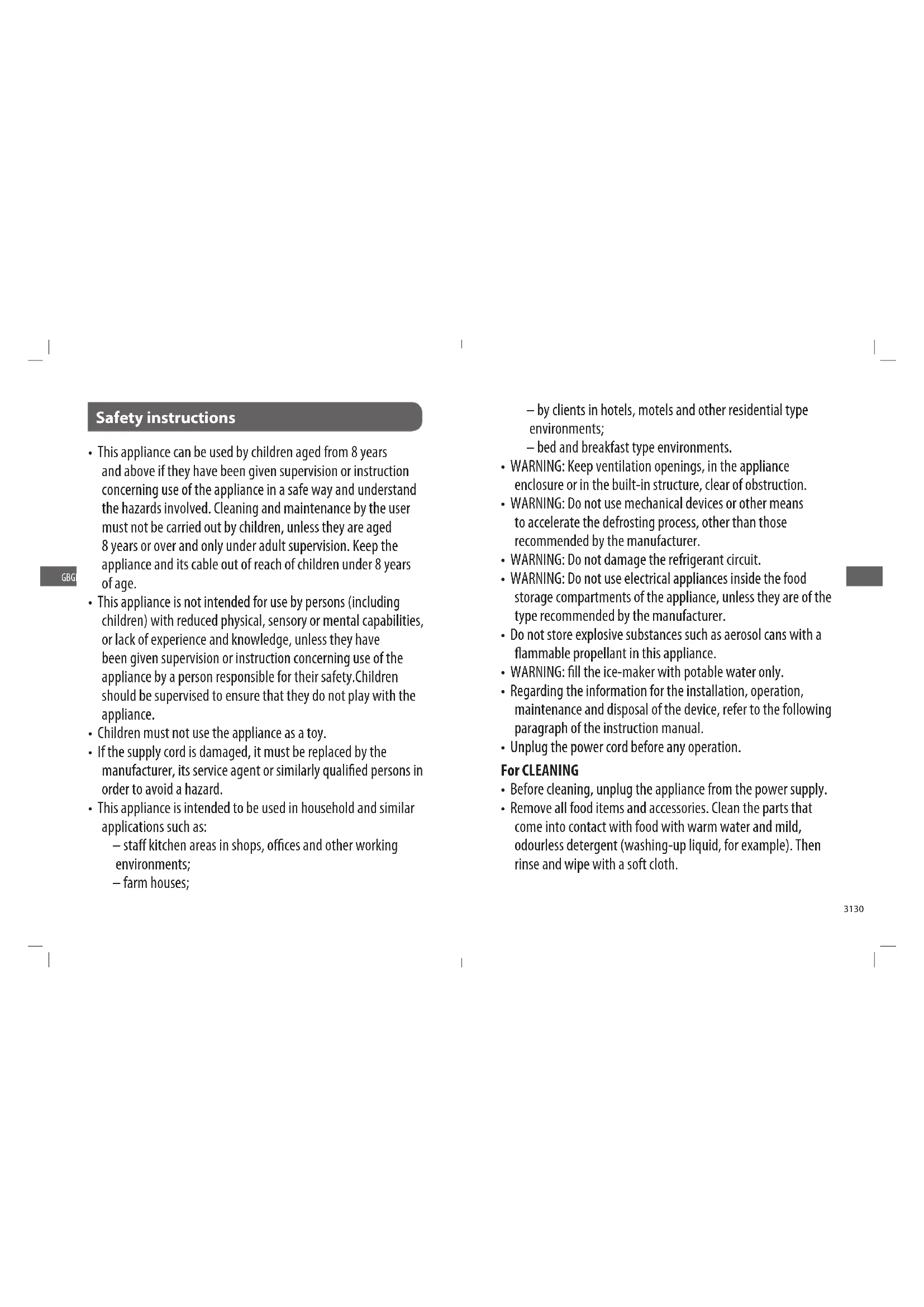 GB GBAccessories Energy label FR/ENG manual Ice box Egg tray Ice scraper Disposal The refrigerating gas contained in the circuit of this appliance is isobutane (R600a); it causes a low level of pollution but is inammable. Please contact your local disposal department for advice on the correct method of disposal. Troubleshooting Before calling for service please check the following. THE APPLIANCE IS NOT WORKING. Check the plug is inserted correctly into the mains socket. Check there is power to the mains socket by plugging another appliance in, if the other appliance do not work either, check the fuse in the plug. THE APPLIANCE IS NOISY WHEN OPERATING. Check the appliance is level and it is not in contact with another appliance or kitchen furniture. THE APPLIANCE DOES NOT COOL SUFFICIENTLY. If the door has been opened too often or it has been left open for a while it will take time for the appliance to reach its set temperature. Check the airow over the rear of the appliance has not been reduced due to insucient clearance. Check if a large quantity of fresh food has been introduced.
