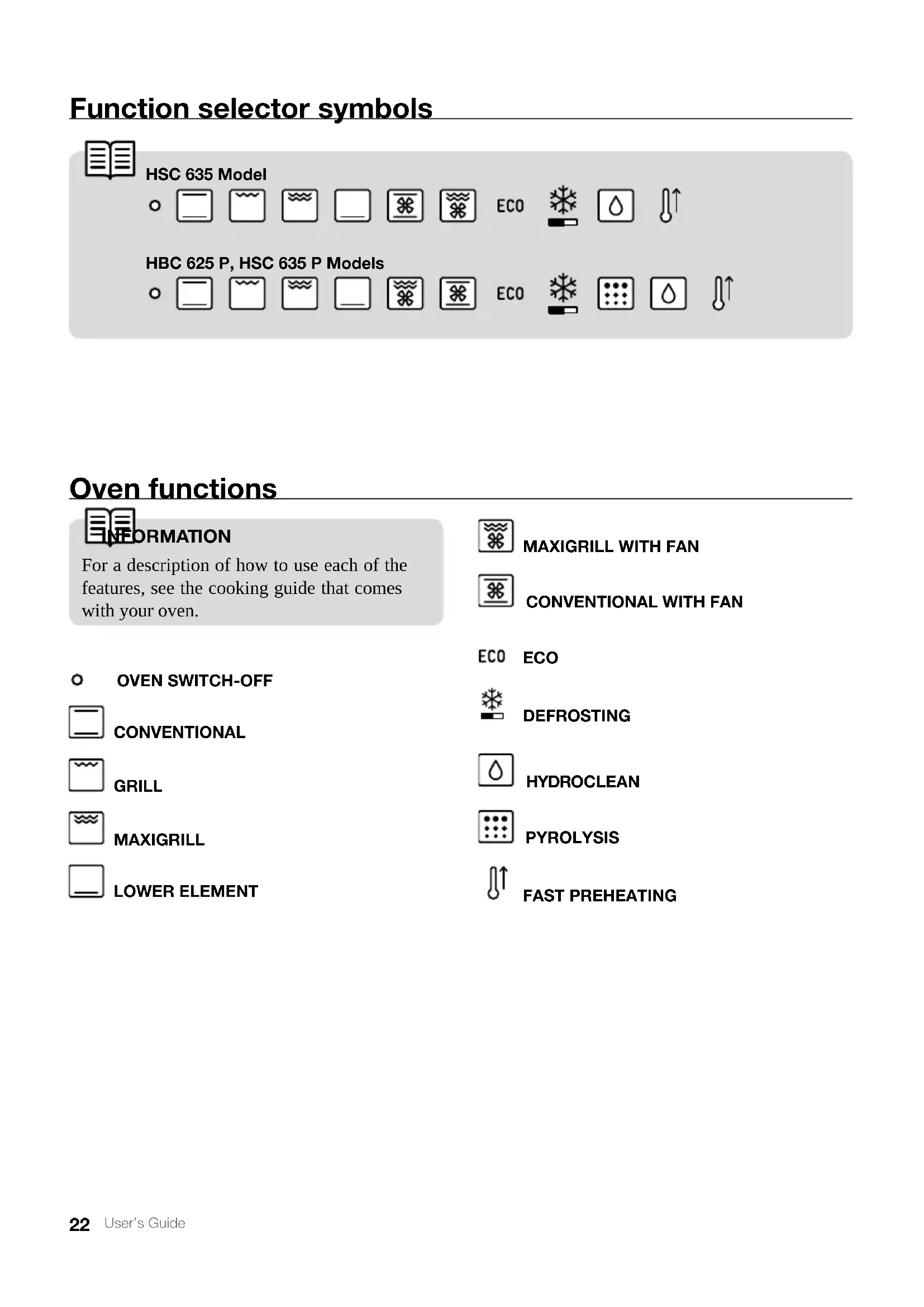 User’s Guide Function selector symbols HSC 635 Model HBC 625 P, HSC 635 P Models Oven functions OVEN SWITCH-OFF CONVENTIONAL GRILL MAXIGRILL LOWER ELEMENT INFORMATION For a description of how to use each of the features, see the cooking guide that comes with your oven.