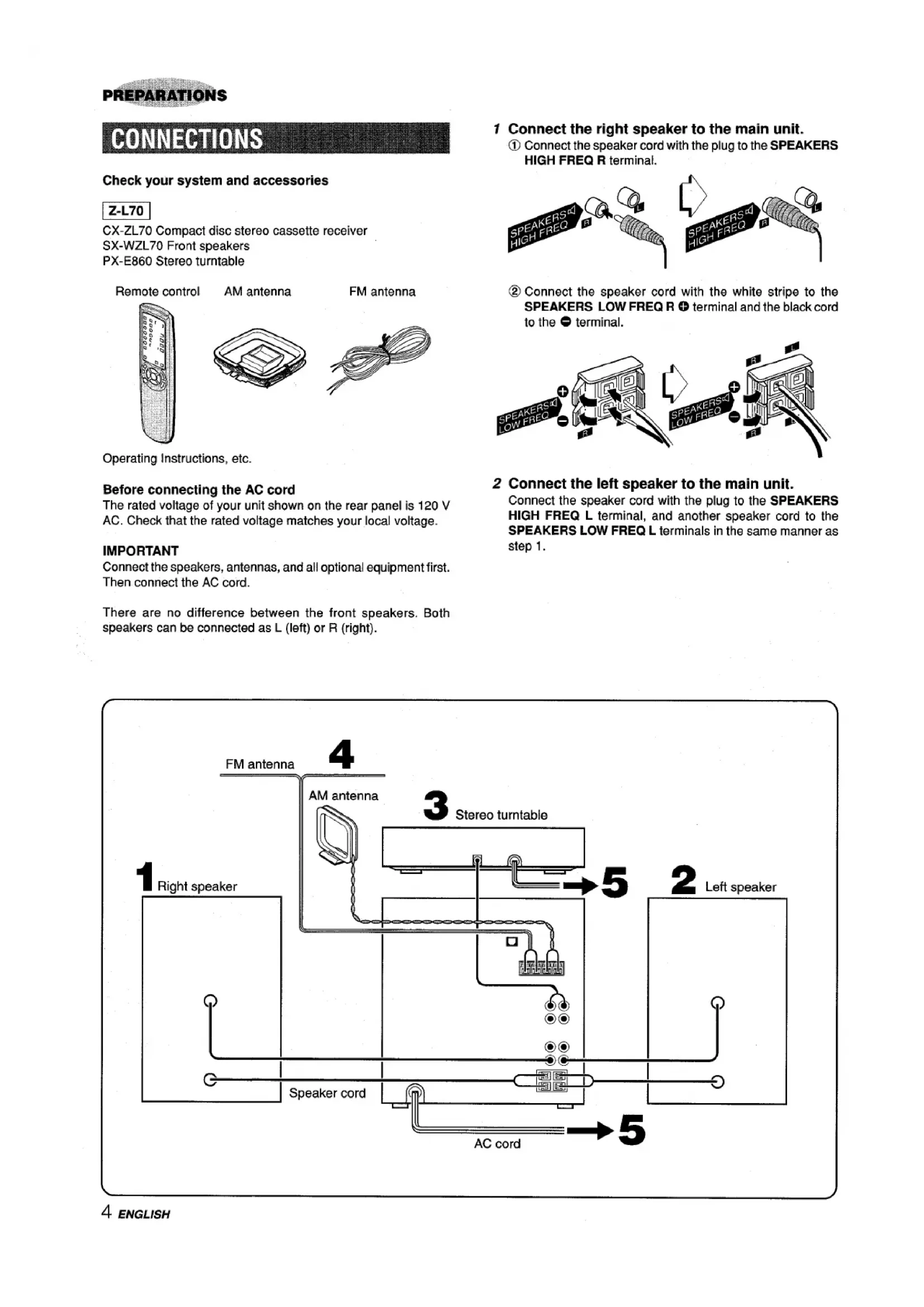 Before connecting the AC cord The rated voltage of your unit shown on the rear panel is 120 V AC. Check that the rated voltage matches your local voltage. IMPORTANT Connect the speakers, antennas, and all optional equipment first. Then connect the AC cord. There are no difference between the front speakers. Both speakers can be connected as L (left) or R (right). @ Connect the speaker cord with the white stripe to the SPEAKERS LOW FREQ R C) terminal and the black cord to the O terminal. 2 Connect the left speaker to the main unit. Connect the speaker cord with the plug to the SPEAKERS HIGH FREQ L terminal, and another speaker cord to the SPEAKERS LOW FREQ L terminals in the same manner as step 1.FM antenna