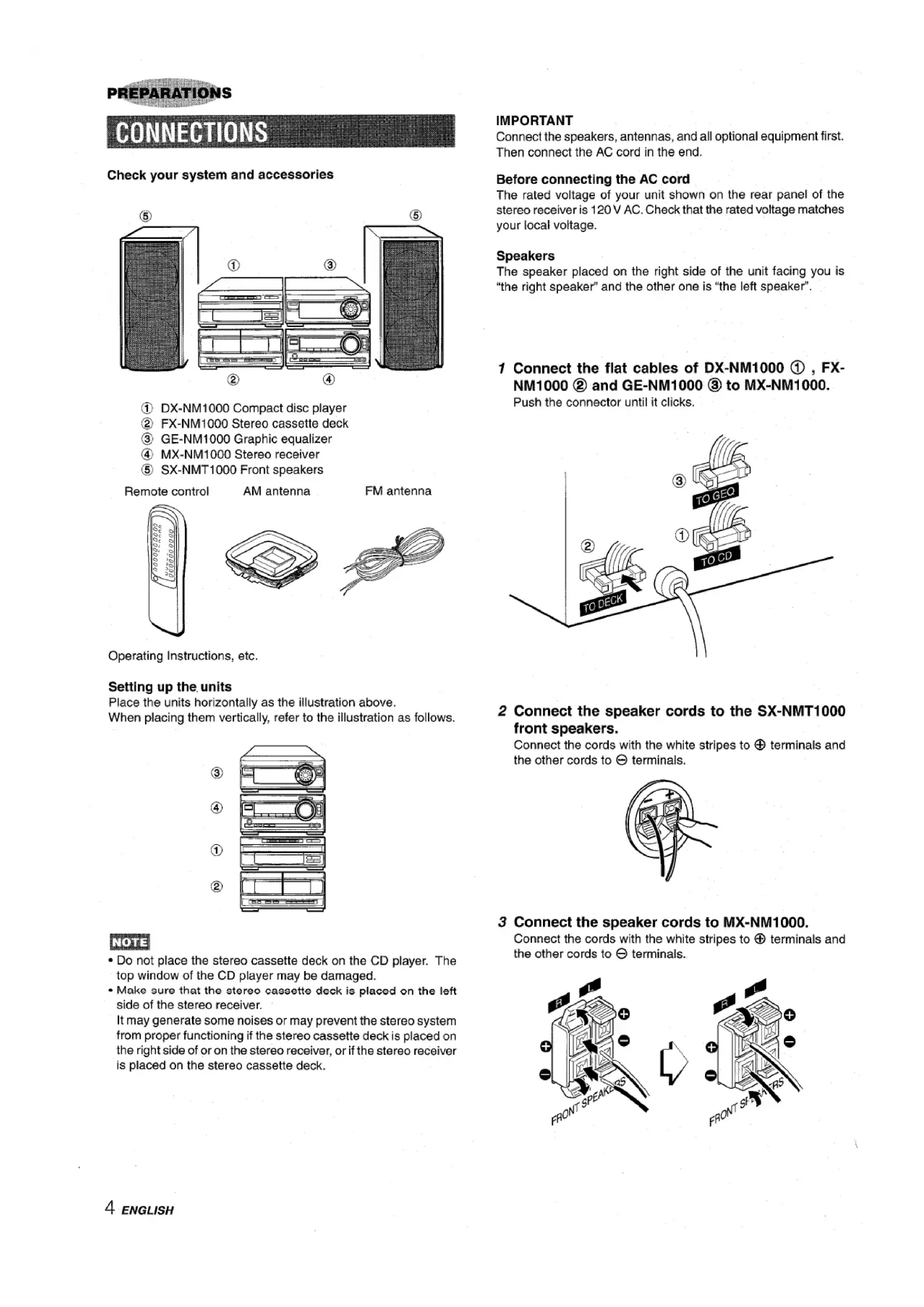 @ DX-NMI 000 Compact disc player @ FX-NM1 000 Stereo cassette deck @ GE-NMIOOO Graphic equalizer @ MX-NMI 000 Stereo receiver @ SX-NMT1 000 Front speakers Remote control AM antenna FM antenna Operating Instructions, etc. Setting up the, units Place the units horizontally as the illustration above. When placing them vertically, refer to the illustration as follows. ● Do not place the stereo cassette deck on the CD player. The top window of the CD player may be damaged. ● Make sure that the stereo cassette deck is placed on the left side of the stereo receiver. It may generate some noises or may prevent the stereo system from proper functioning if the stereo cassette deck is placed on the right side of or on the stereo receiver, or if the stereo receiver is placed on the stereo cassette deck. Connect the speakers, antennas, and all optional equipment first. Then connect the AC cord in the end. Before connecting the AC cord The rated voltage of your unit shown on the rear panel of the stereo receiver is 120 V AC. Check that the rated voltage matches your local voltage. Speakers The speaker placed on the right side of the unit facing you is “the right speaker” and the other one is “the left speaker”.