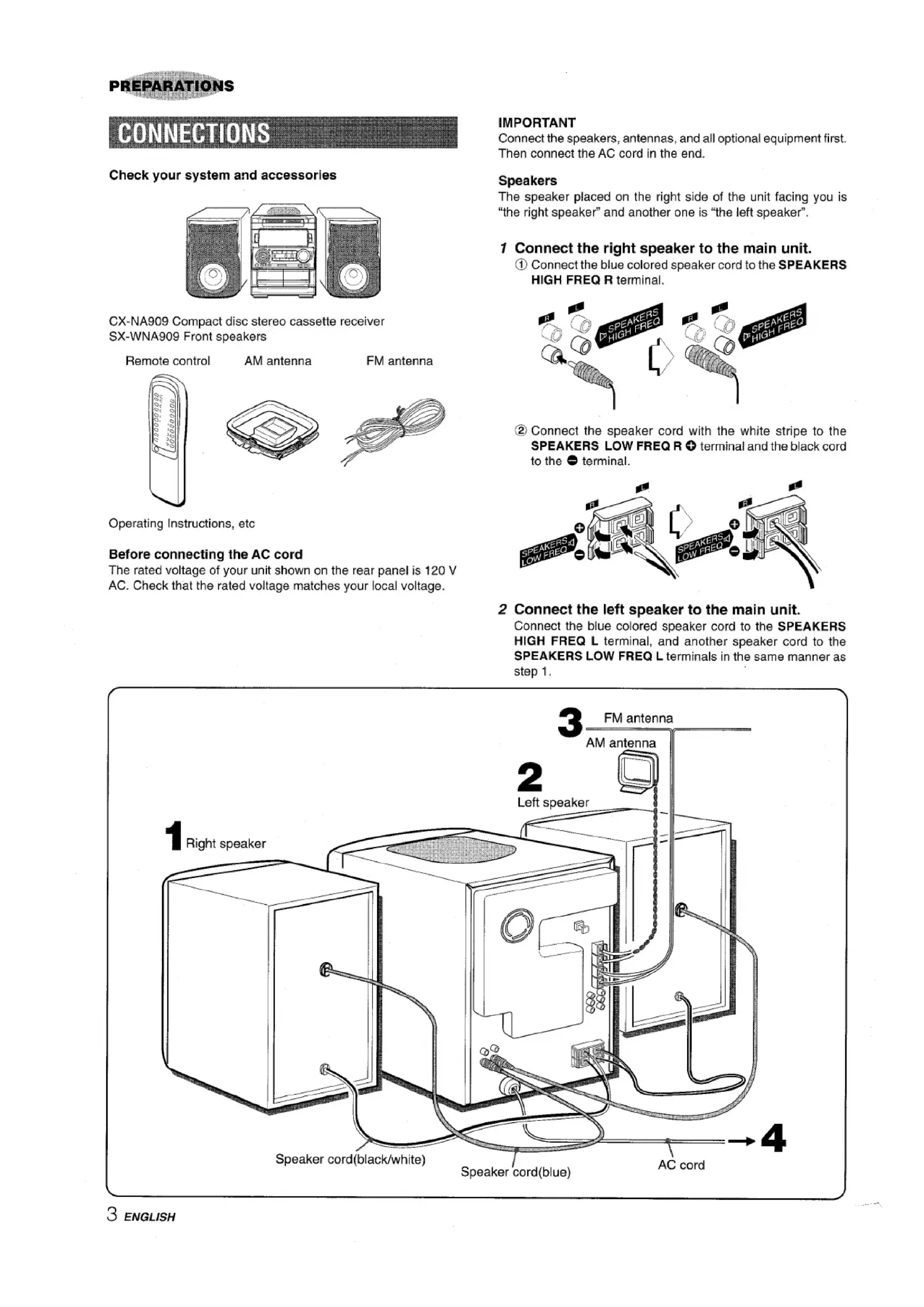 ..,..3, !*.-.,,,.. 8IMPORTANT Connect the speakers, antennas, and all optional equipment first. Then connect the AC cord in the end. Check your system and accessories Speakers The speaker placed on the right side of the unit facing you is “the right speaker” and another one is “the left speaker”,