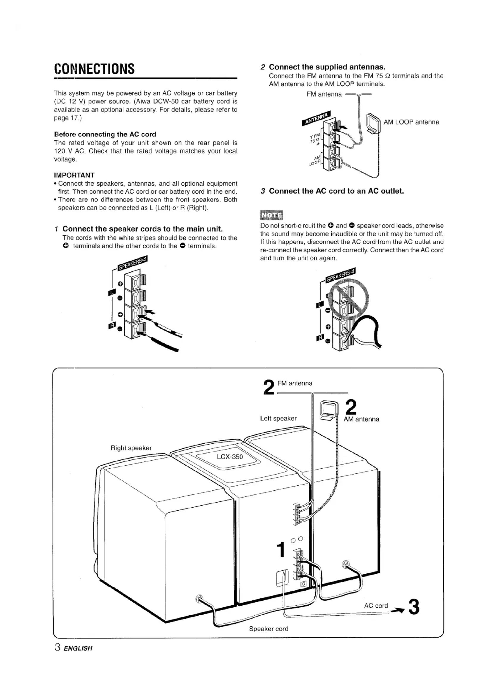 This system may be powered by an AC voltage or car battery (.3C 12 V) power source. (Aiwa DCW-50 car battery cord is available as an optional accessory, For details, please refer to page 17.)Elefcweconnecting the AC cord The rated voltage of your unit shown on the rear panel is 120 V AC. Check that the rated voltage matches your local voltage.IMPORTANT ● Connect the speakers, antennas, and all optional equipment first. Then connect the AC cord or car battery cord in the end, ● There are no differences between the front speakers. Both speakers can be connected as L (Left) or R (Right).