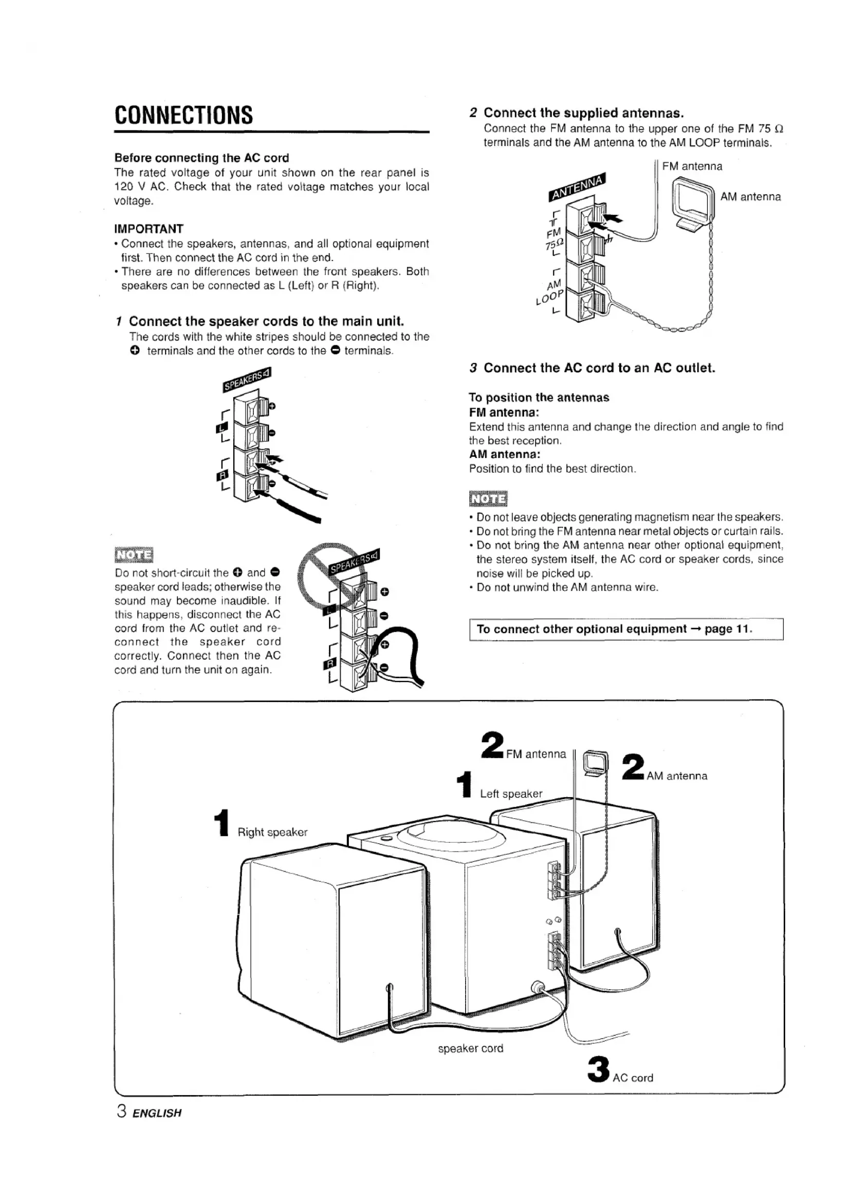 ENGLISH 2CONNECTIONS Before connecting the AC cord The rated voltage of your unit shown on the rear panel is 120 V AC, Check that the rated voltage matches your local voltage.IMPORTANT ● Connect the speakers, antennas, and all optional equipment first. Then connect the AC cord in the end. ● There are no differences between the front speakers. Both speakers can be connected as L (Left) or R (Right).