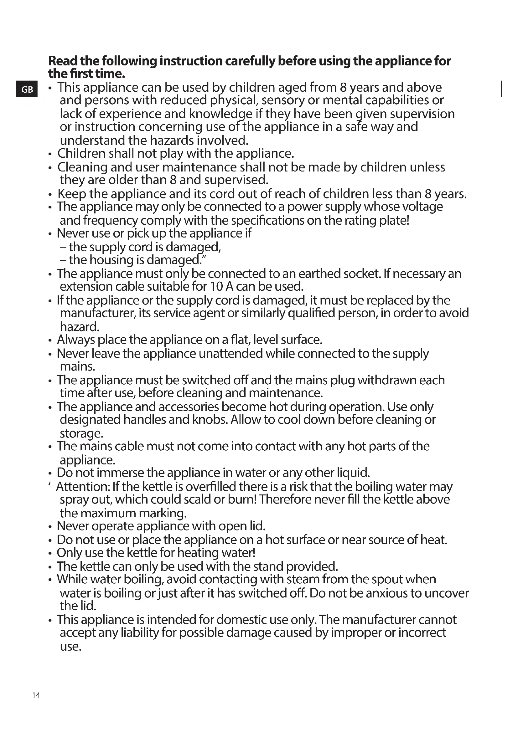 - Do not immerse the appliance in water or any other liquid. ‘ Attention: If the kettle is overlled there is a risk that the boiling water may spray out, which could scald or burn! Therefore never ll the kettle above the maximum marking.
