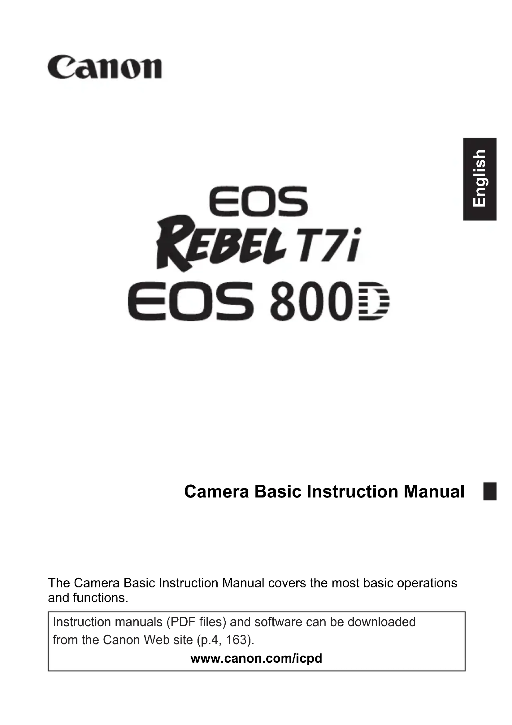 Manual de instrucciones básicas Mode d’emploi de base Basic Instruction Manual Français EnglishEspañolThe Camera Basic Instruction Manual covers the most basic operations and functions. Camera Basic Instruction Manual Instruction manuals (PDF files) and software can be downloaded from the Canon Web site (p.4, 163). English www.canon.com/icpd2 The EOS REBEL T7i or EOS 800D is a digital single-lens reflex camera featuring a fine-detail CMOS sensor with approx. 24.2 effective megapixels, DIGIC 7, high-precision and high-speed 45-point AF (up to 45 cross-type AF points), maximum continuous shooting speed of approx. 6.0 shots/sec., Live View shooting, Full High-Definition (Full HD) movie shooting, and Wi-Fi/NFC/Bluetooth (wireless communication) function. Before Starting to Shoot, Be Sure to Read the Following To avoid botched pictures and accidents, first read the “Safety Precautions” (p.15-17) and “Handling Precautions” (p.18-20). Also, read this manual carefully to ensure that you use the camera correctly. Refer to This Manual while Using the Camera to Further Familiarize Yourself with the Camera While reading this manual, take a few test shots and see how they come out. You can then better understand the camera. Be sure to store this manual safely, too, so that you can refer to it again when necessary. Testing the Camera Before Use and Liability After shooting, play images back and check whether they have been properly recorded. If the camera or memory card is faulty and the images cannot be recorded or downloaded to a computer, Canon cannot be held liable for any loss or inconvenience caused. Copyrights Copyright laws in your country may prohibit the use of your recorded images or copyrighted music and images with music on the memory card for anything other than private enjoyment. Also be aware that certain public performances, exhibitions, etc., may prohibit photography even for private enjoyment. Introduction3 Before starting, check that all the following items are included with your camera. If anything is missing, contact your dealer.