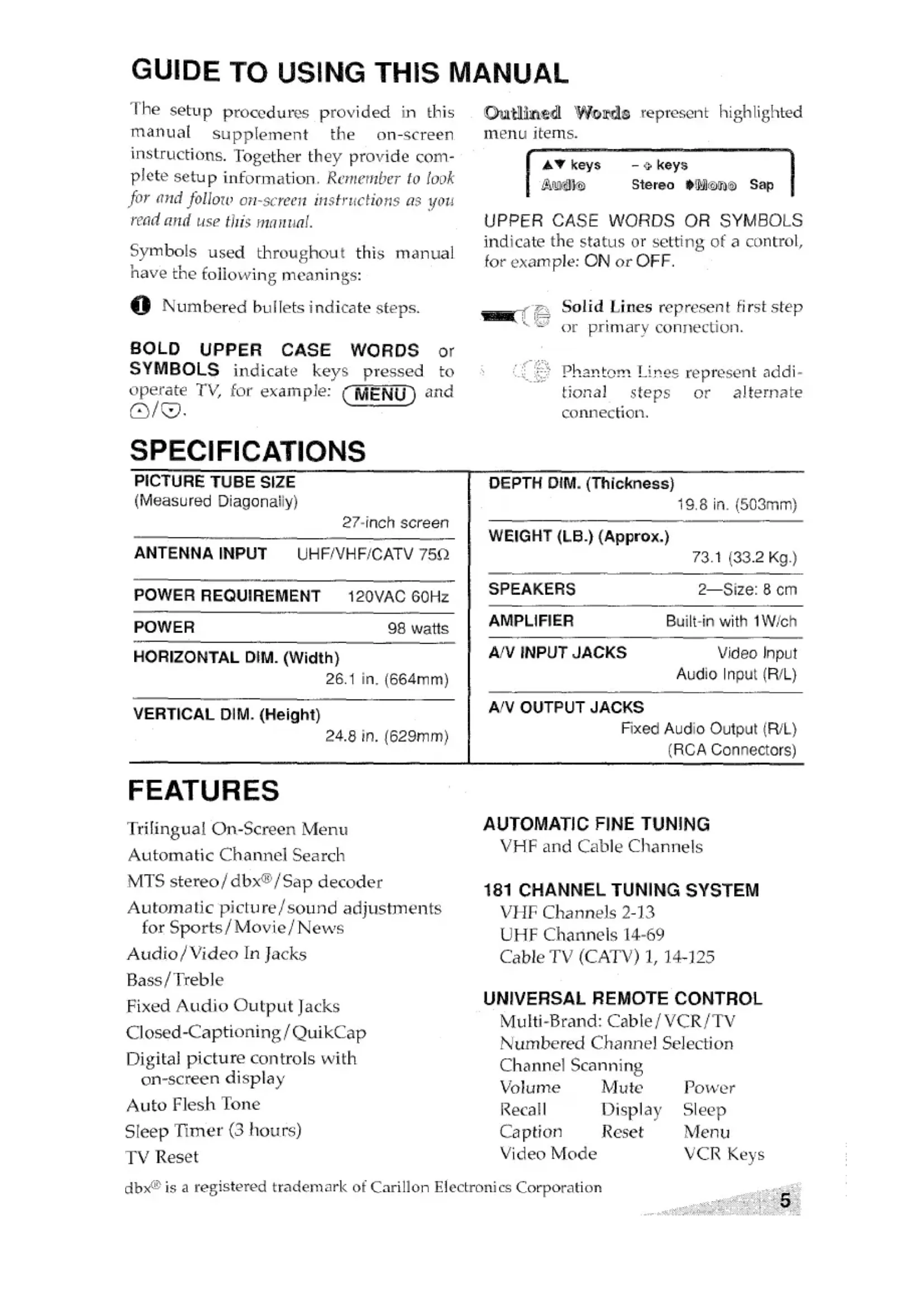 FEATURES Trilingual On-screen Menu Automatic Ch armel Search MTS stereo/ clbx~l Sap decoder Automatic picture/sound adjustments for Sports/ Movie/ News Audio/Video In Jacks Bass /Treble Fixed Audio Output Jacks Closed-Captioning /QuikCap Digital picture controls with on-screen display Auto Flesh Tone Sleep Timer (3 hours) TV Reset Solid Lines represent first step or primary connection. Pb.aRtern. Lines represent addi- tioL-Lal steps ,9~ ~!terna~e cormection. DEPTH DIM. (Thickness)