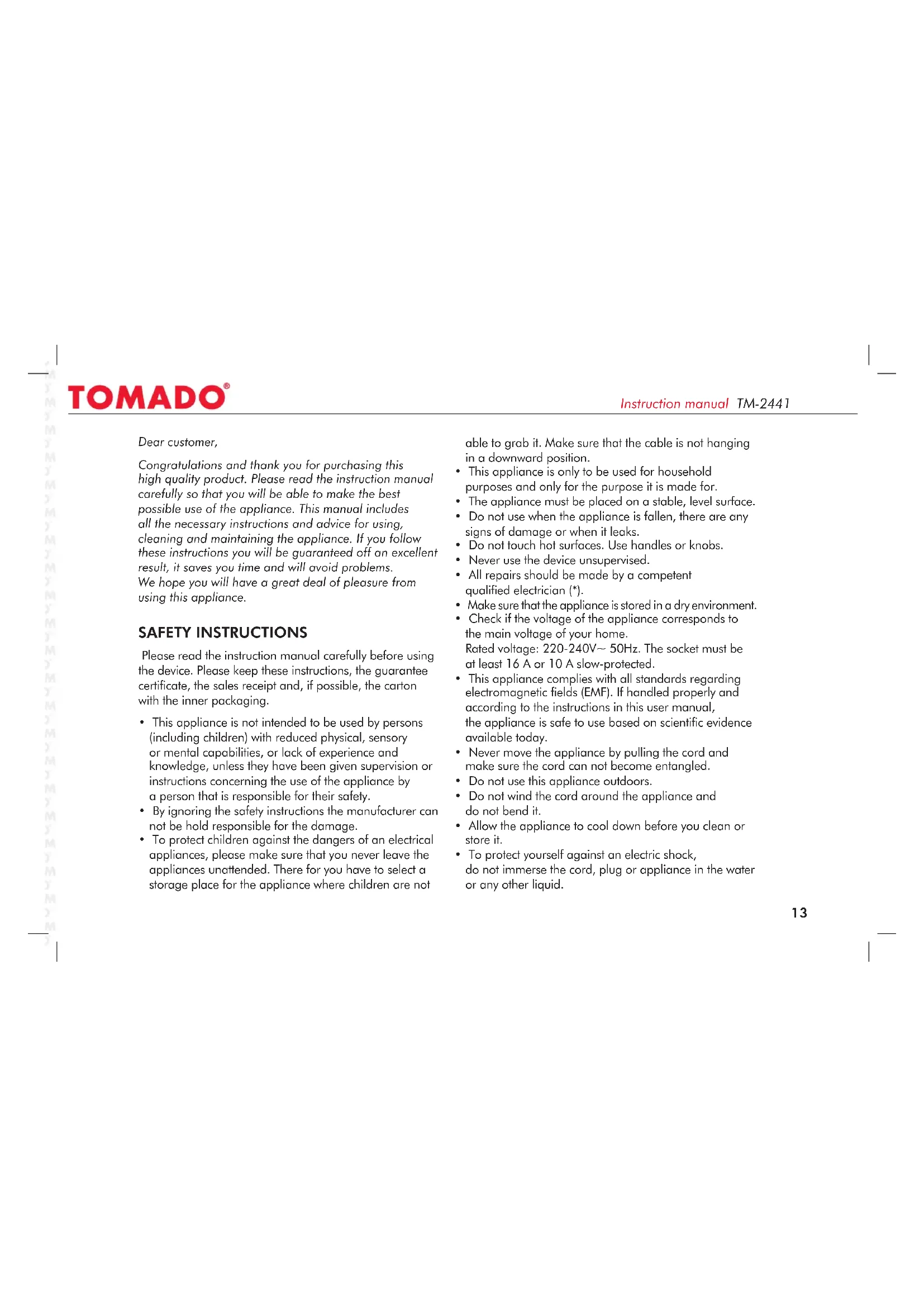 We would like to congratulate you on buying an appliance from the TOMADO product range.
