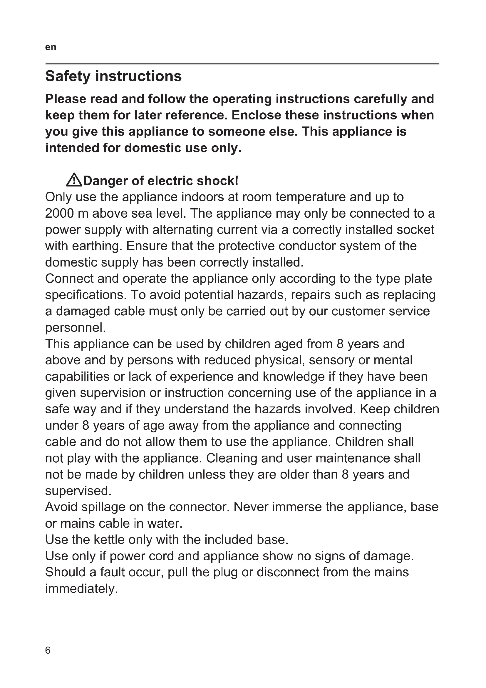 Safety instructions Please read and follow the operating instructions carefully and keep them for later reference. Enclose these instructions when you give this appliance to someone else. This appliance is intended for domestic use only. WDanger of electric shock! Only use the appliance indoors at room temperature and up to 2000 m above sea level. The appliance may only be connected to a power supply with alternating current via a correctly installed socket with earthing. Ensure that the protective conductor system of the domestic supply has been correctly installed. Connect and operate the appliance only according to the type plate specications. To avoid potential hazards, repairs such as replacing a damaged cable must only be carried out by our customer service personnel. This appliance can be used by children aged from 8 years and above and by persons with reduced physical, sensory or mental capabilities or lack of experience and knowledge if they have been given supervision or instruction concerning use of the appliance in a safe way and if they understand the hazards involved. Keep children under 8 years of age away from the appliance and connecting cable and do not allow them to use the appliance. Children shall not play with the appliance. Cleaning and user maintenance shall not be made by children unless they are older than 8 years and supervised. Avoid spillage on the connector. Never immerse the appliance, base or mains cable in water. Use the kettle only with the included base. Use only if power cord and appliance show no signs of damage. Should a fault occur, pull the plug or disconnect from the mains immediately.7