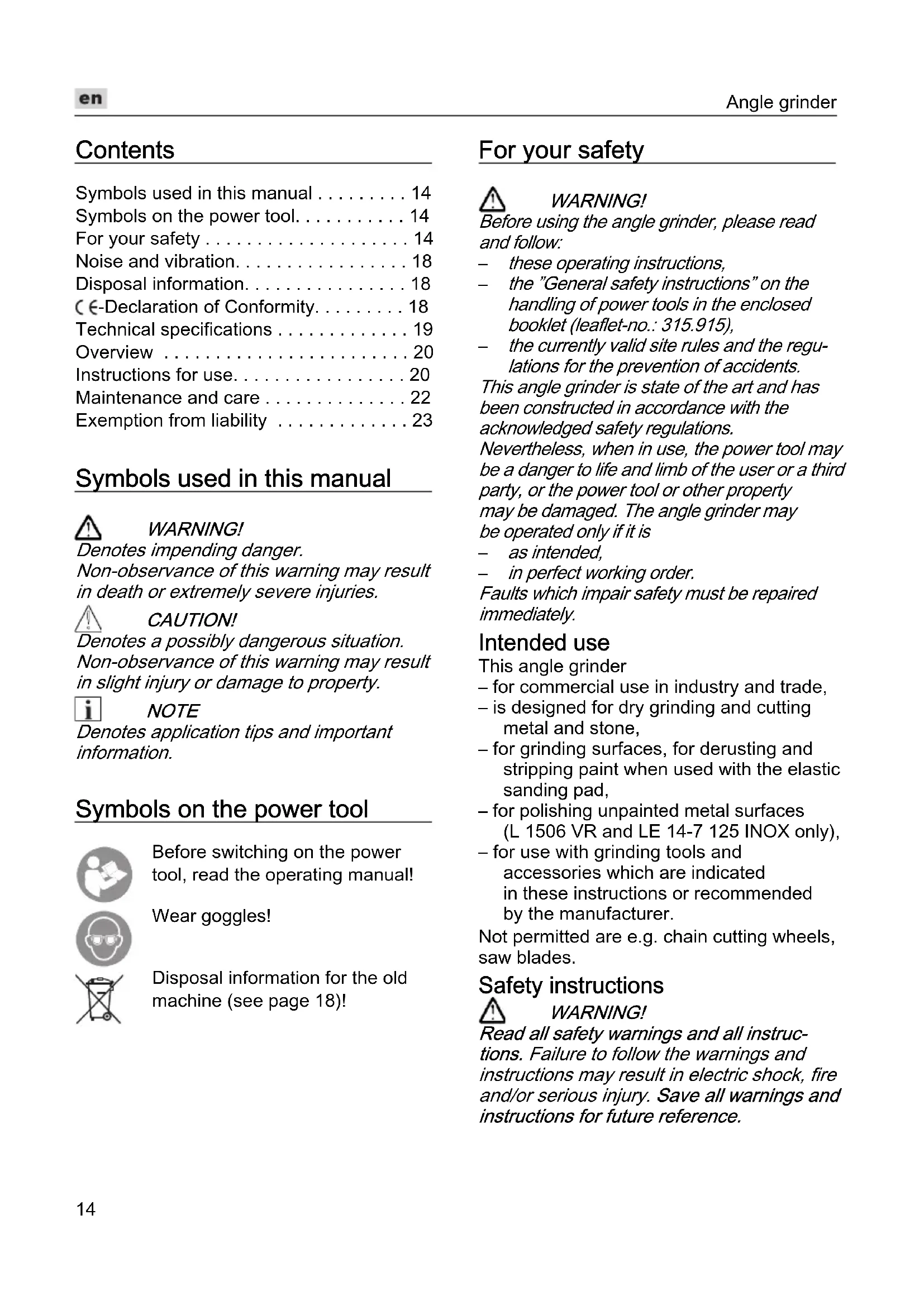 in perfect working order. Faults which impair safety must be repaired immediately. Intended use This angle grinder – for commercial use in industry and trade, – is designed for dry grinding and cutting metal and stone, – for grinding surfaces, for derusting and stripping paint when used with the elastic sanding pad, – for polishing unpainted metal surfaces (L 1506 VR and LE 14-7 125 INOX only), – for use with grinding tools and accessories which are indicated in these instructions or recommended by the manufacturer. Not permitted are e.g. chain cutting wheels, saw blades. Safety instructions WARNING! Read all safety warnings and all instruc- tions. Failure to follow the warnings and instructions may result in electric shock, fire and/or serious injury. Save all warnings and instructions for future reference.Angle grinder