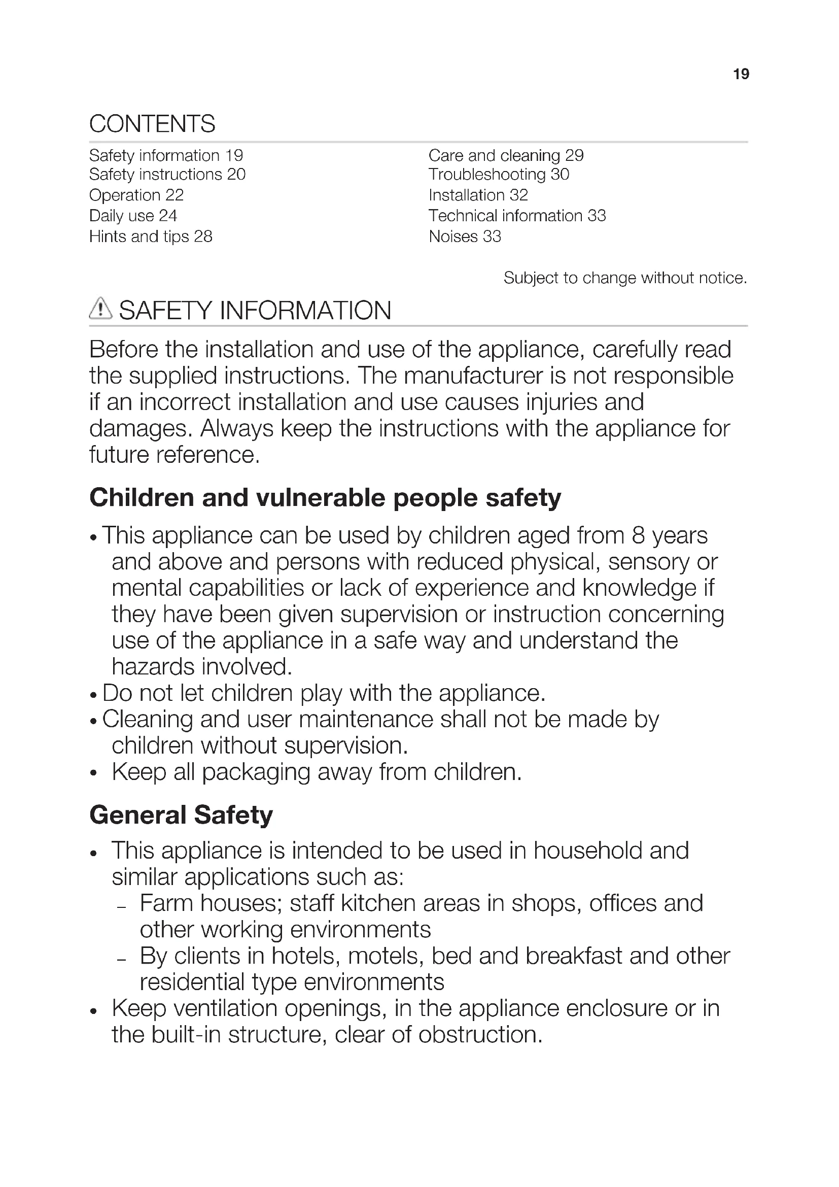- If the supply cord is damaged, it must be replaced by the manufacturer, its Authorised Service Centre or similarly qualified persons in order to avoid a hazard. SAFETY INSTRUCTIONS Installation WARNING! Only a qualified person must install this appliance.