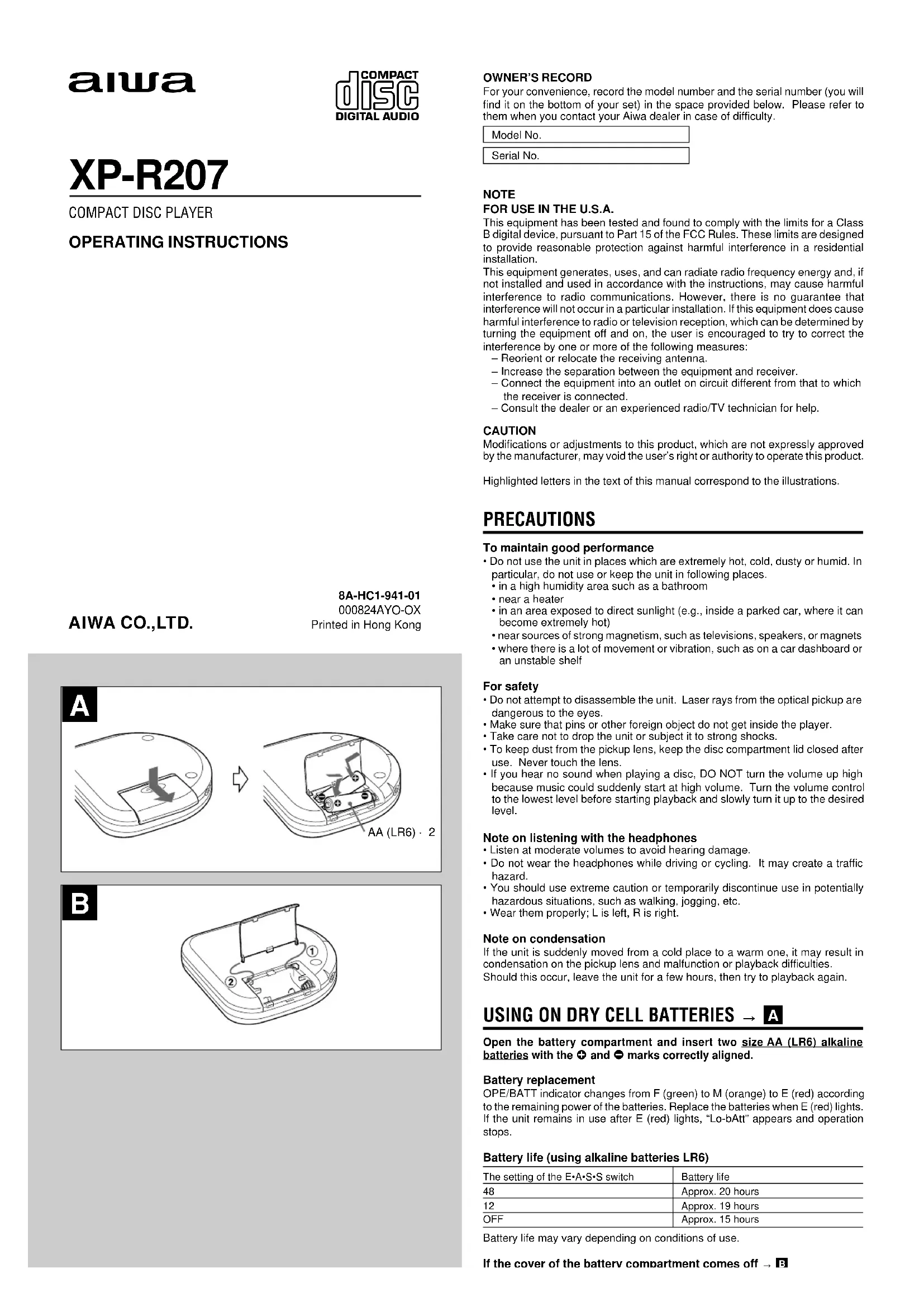 OWNER’S RECORDFor your convenience, record the model number and the serial number (you willfind it on the bottom of your set) in the space provided below. Please refer tothem when you contact your Aiwa dealer in case of difficulty.Model No.Serial No. NOTE FOR USE IN THE U.S.A.This equipment has been tested and found to comply with the limits for a ClassB digital device, pursuant to Part 15 of the FCC Rules. These limits are designedto provide reasonable protection against harmful interference in a residentialinstallation.This equipment generates, uses, and can radiate radio frequency energy and, ifnot installed and used in accordance with the instructions, may cause harmfulinterference to radio communications. However, there is no guarantee thatinterference will not occur in a particular installation. If this equipment does causeharmful interference to radio or television reception, which can be determined byturning the equipment off and on, the user is encouraged to try to correct theinterference by one or more of the following measures:– Reorient or relocate the receiving antenna.– Increase the separation between the equipment and receiver.– Connect the equipment into an outlet on circuit different from that to whichthe receiver is connected.– Consult the dealer or an experienced radio/TV technician for help.CAUTIONModifications or adjustments to this product, which are not expressly approvedby the manufacturer, may void the user’s right or authority to operate this product.Highlighted letters in the text of this manual correspond to the illustrations. PRECAUTIONS To maintain good performance• Do not use the unit in places which are extremely hot, cold, dusty or humid. Inparticular, do not use or keep the unit in following places.• in a high humidity area such as a bathroom• near a heater• in an area exposed to direct sunlight (e.g., inside a parked car, where it canbecome extremely hot)• near sources of strong magnetism, such as televisions, speakers, or magnets• where there is a lot of movement or vibration, such as on a car dashboard oran unstable shelfFor safety• Do not attempt to disassemble the unit. Laser rays from the optical pickup aredangerous to the eyes.• Make sure that pins or other foreign object do not get inside the player.• Take care not to drop the unit or subject it to strong shocks.• To keep dust from the pickup lens, keep the disc compartment lid closed afteruse. Never touch the lens.• If you hear no sound when playing a disc, DO NOT turn the volume up highbecause music could suddenly start at high volume. Turn the volume controlto the lowest level before starting playback and slowly turn it up to the desiredlevel.Note on listening with the headphones• Listen at moderate volumes to avoid hearing damage.• Do not wear the headphones while driving or cycling. It may create a traffichazard.• You should use extreme caution or temporarily discontinue use in potentiallyhazardous situations, such as walking, jogging, etc.• Wear them properly; L is left, R is right.Note on condensationIf the unit is suddenly moved from a cold place to a warm one, it may result incondensation on the pickup lens and malfunction or playback difficulties.Should this occur, leave the unit for a few hours, then try to playback again.