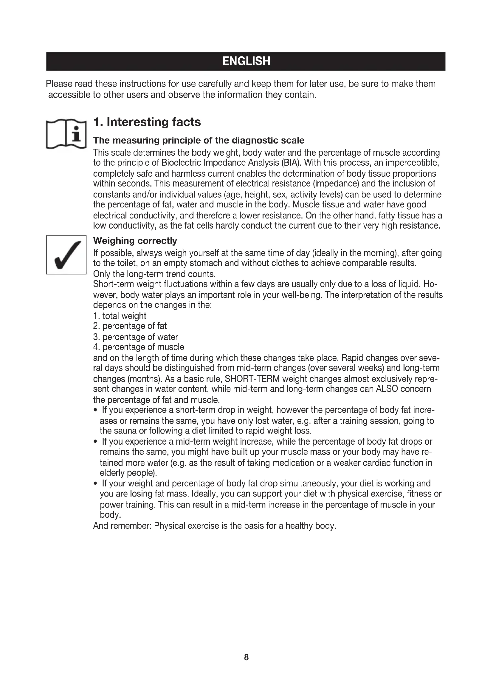 The measuring principle of the diagnostic scale This scale determines the body weight, body water and the percentage of muscle according to the principle of Bioelectric Impedance Analysis (BIA). With this process, an imperceptible, completely safe and harmless current enables the determination of body tissue proportions within seconds. This measurement of electrical resistance (impedance) and the inclusion of constants and/or individual values (age, height, sex, activity levels) can be used to determine the percentage of fat, water and muscle in the body. Muscle tissue and water have good electrical conductivity, and therefore a lower resistance. On the other hand, fatty tissue has a low conductivity, as the fat cells hardly conduct the current due to their very high resistance. Weighing correctly If possible, always weigh yourself at the same time of day (ideally in the morning), after going to the toilet, on an empty stomach and without clothes to achieve comparable results. Only the long-term trend counts. Short-term weight fluctuations within a few days are usually only due to a loss of liquid. Ho- wever, body water plays an important role in your well-being. The interpretation of the results depends on the changes in the: