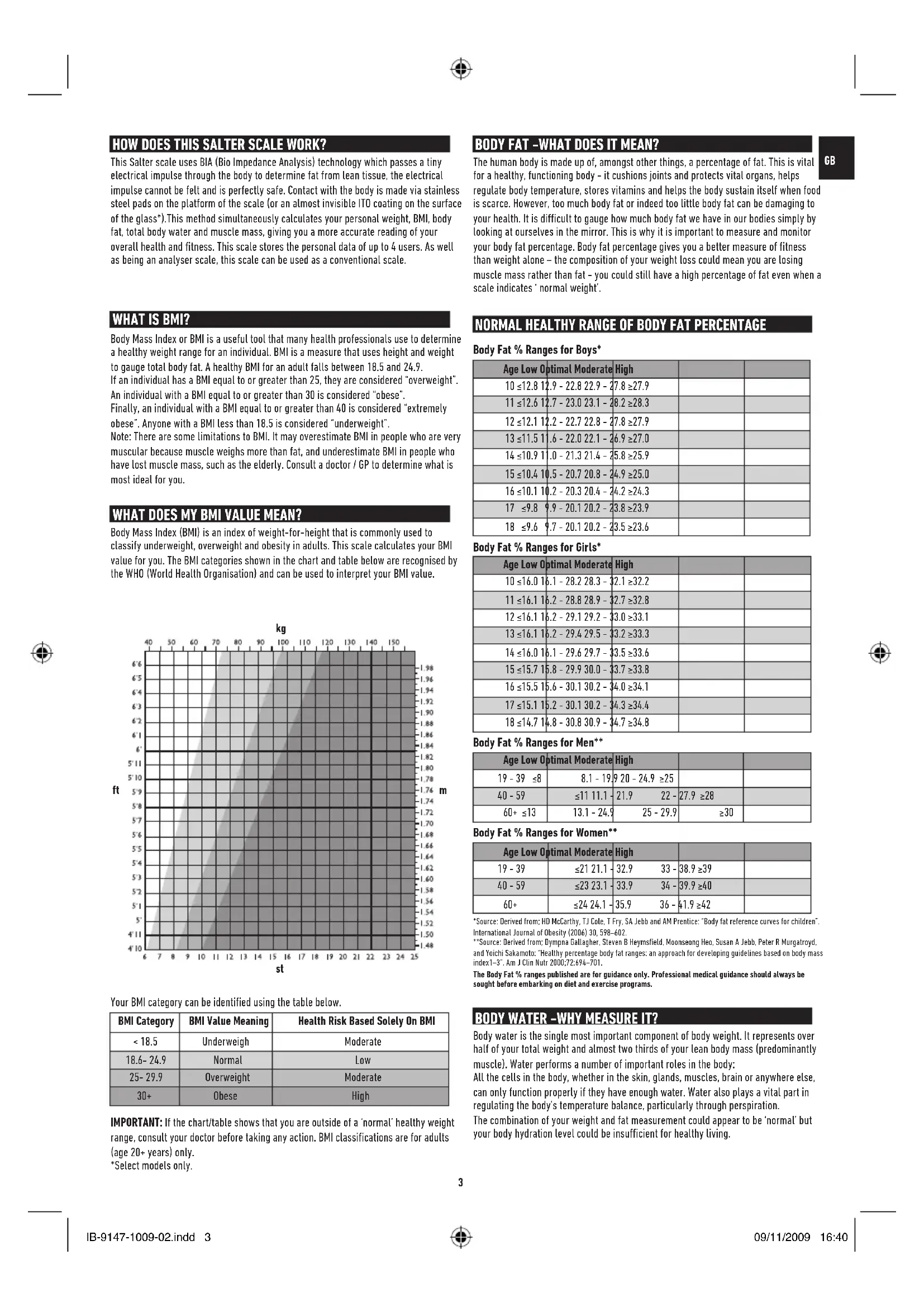 HOW DOES THIS SALTER SCALE WORK? This Salter scale uses BIA (Bio Impedance Analysis) technology which passes a tiny electrical impulse through the body to determine fat from lean tissue, the electrical impulse cannot be felt and is perfectly safe. Contact with the body is made via stainless steel pads on the platform of the scale (or an almost invisible ITO coating on the surface of the glass*).This method simultaneously calculates your personal weight, BMI, body fat, total body water and muscle mass, giving you a more accurate reading of your overall health and fitness. This scale stores the personal data of up to 4 users. As well as being an analyser scale, this scale can be used as a conventional scale. BODY FAT -WHAT DOES IT MEAN? The human body is made up of, amongst other things, a percentage of fat. This is vital for a healthy, functioning body - it cushions joints and protects vital organs, helps regulate body temperature, stores vitamins and helps the body sustain itself when food is scarce. However, too much body fat or indeed too little body fat can be damaging to your health. It is dicult to gauge how much body fat we have in our bodies simply by looking at ourselves in the mirror. This is why it is important to measure and monitor your body fat percentage. Body fat percentage gives you a better measure of fitness than weight alone – the composition of your weight loss could mean you are losing muscle mass rather than fat - you could still have a high percentage of fat even when a scale indicates ‘ normal weight’. BODY WATER -WHY MEASURE IT? Body water is the single most important component of body weight. It represents over half of your total weight and almost two thirds of your lean body mass (predominantly muscle). Water performs a number of important roles in the body: All the cells in the body, whether in the skin, glands, muscles, brain or anywhere else, can only function properly if they have enough water. Water also plays a vital part in regulating the body’s temperature balance, particularly through perspiration. The combination of your weight and fat measurement could appear to be ‘normal’ but your body hydration level could be insucient for healthy living. NORMAL HEALTHY RANGE OF BODY FAT PERCENTAGE Body Fat % Ranges for Boys* Age Low Optimal Moderate High 10 ≤12.8 12.9 - 22.8 22.9 - 27.8 ≥27.9 11 ≤12.6 12.7 - 23.0 23.1 - 28.2 ≥28.3 12 ≤12.1 12.2 - 22.7 22.8 - 27.8 ≥27.9 13 ≤11.5 11.6 - 22.0 22.1 - 26.9 ≥27.0 14 ≤10.9 11.0 - 21.3 21.4 - 25.8 ≥25.9 15 ≤10.4 10.5 - 20.7 20.8 - 24.9 ≥25.0 16 ≤10.1 10.2 - 20.3 20.4 - 24.2 ≥24.3 17 ≤9.8 9.9 - 20.1 20.2 - 23.8 ≥23.9 18 ≤9.6 9.7 - 20.1 20.2 - 23.5 ≥23.6 Body Fat % Ranges for Girls* Age Low Optimal Moderate High 10 ≤16.0 16.1 - 28.2 28.3 - 32.1 ≥32.2 11 ≤16.1 16.2 - 28.8 28.9 - 32.7 ≥32.8 12 ≤16.1 16.2 - 29.1 29.2 - 33.0 ≥33.1 13 ≤16.1 16.2 - 29.4 29.5 - 33.2 ≥33.3 14 ≤16.0 16.1 - 29.6 29.7 - 33.5 ≥33.6 15 ≤15.7 15.8 - 29.9 30.0 - 33.7 ≥33.8 16 ≤15.5 15.6 - 30.1 30.2 - 34.0 ≥34.1 17 ≤15.1 15.2 - 30.1 30.2 - 34.3 ≥34.4 18 ≤14.7 14.8 - 30.8 30.9 - 34.7 ≥34.8 Body Fat % Ranges for Men** Age Low Optimal Moderate High