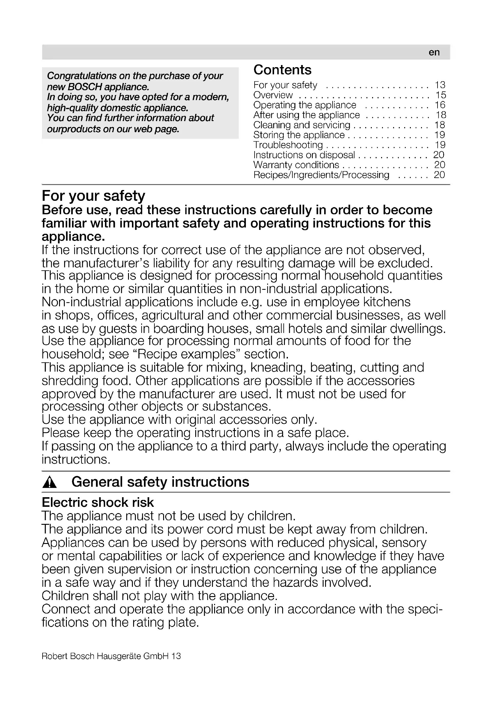 - Recipes/Ingredients/Processing For your safety Before use, read these instructions carefully in order to become familiar with important safety and operating instructions for this appliance. If the instructions for correct use of the appliance are not observed, the manufacturer’s liability for any resulting damage will be excluded. This appliance is designed for processing normal household quantities in the home or similar quantities in non-industrial applications. Non-industrial applications include e.g. use in employee kitchens in shops, offices, agricultural and other commercial businesses, as well as use by guests in boarding houses, small hotels and similar dwellings. Use the appliance for processing normal amounts of food for the household; see “Recipe examples” section. This appliance is suitable for mixing, kneading, beating, cutting and shredding food. Other applications are possible if the accessories approved by the manufacturer are used. It must not be used for processing other objects or substances. Use the appliance with original accessories only. Please keep the operating instructions in a safe place. If passing on the appliance to a third party, always include the operating instructions. , General safety instructions Electric shock risk The appliance must not be used by children. The appliance and its power cord must be kept away from children. Appliances can be used by persons with reduced physical, sensory or mental capabilities or lack of experience and knowledge if they have been given supervision or instruction concerning use of the appliance in a safe way and if they understand the hazards involved. Children shall not play with the appliance. Connect and operate the appliance only in accordance with the speci- fications on the rating plate. p. 20