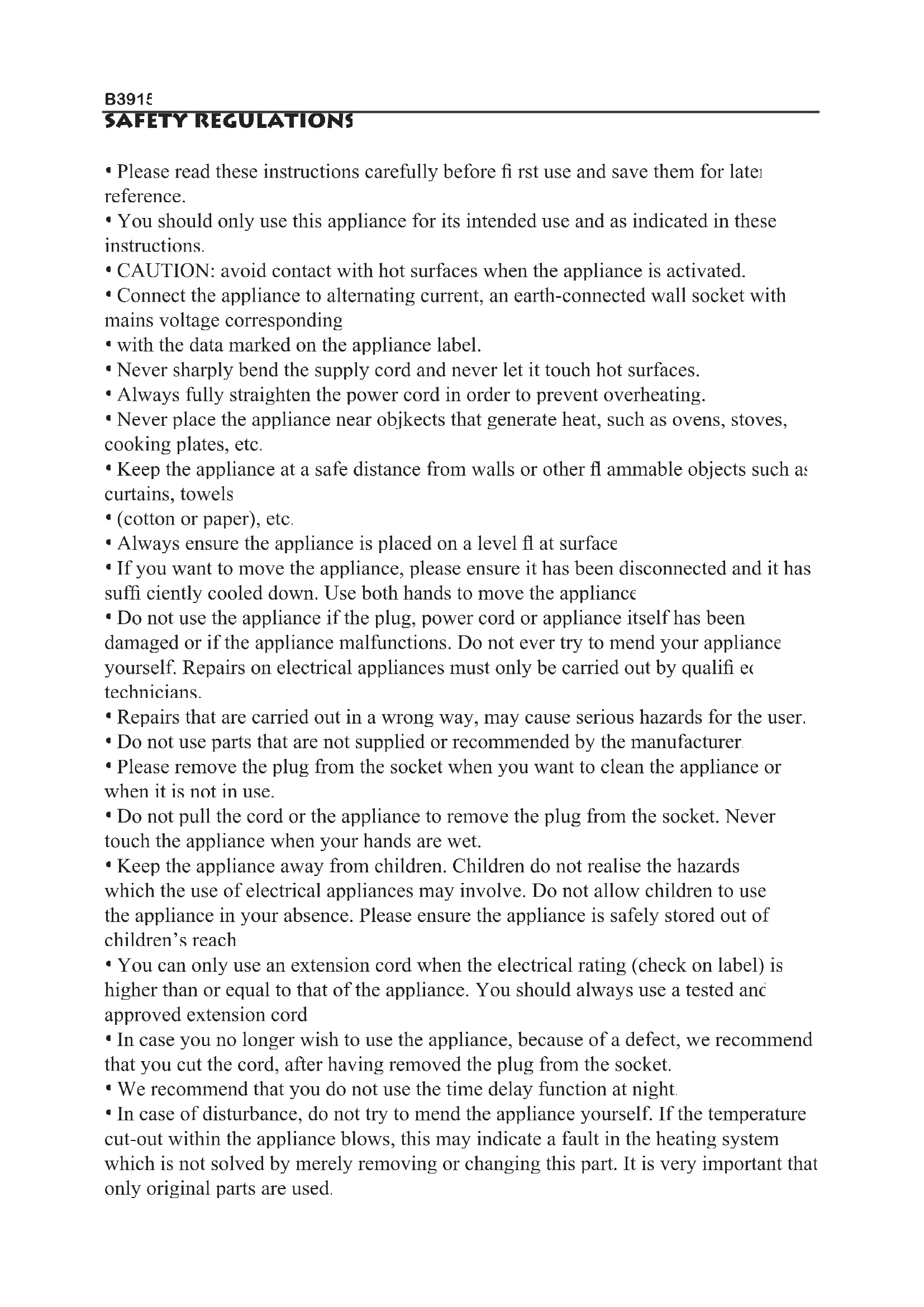 In case of disturbance, do not try to mend the appliance yourself. If the temperature cut-out within the appliance blows, this may indicate a fault in the heating system which is not solved by merely removing or changing this part. It is very important that only original parts are used.B3915
