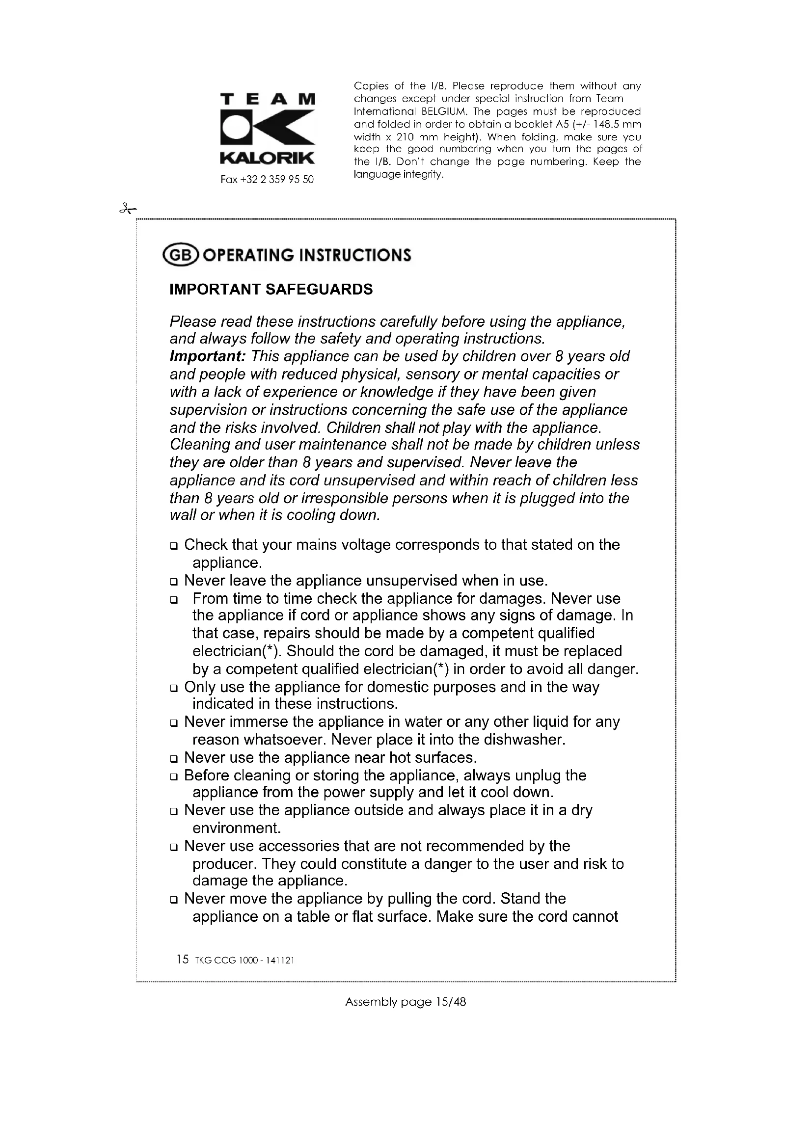 IMPORTANT SAFEGUARDS Please read these instructions carefully before using the appliance, and always follow the safety and operating instructions. Important: This appliance can be used by children over 8 years old and people with reduced physical, sensory or mental capacities or with a lack of experience or knowledge if they have been given supervision or instructions concerning the safe use of the appliance and the risks involved. Children shall not play with the appliance. Cleaning and user maintenance shall not be made by children unless they are older than 8 years and supervised. Never leave the appliance and its cord unsupervised and within reach of children less than 8 years old or irresponsible persons when it is plugged into the wall or when it is cooling down. q Check that your mains voltage corresponds to that stated on the appliance. q Never leave the appliance unsupervised when in use. q From time to time check the appliance for damages. Never use the appliance if cord or appliance shows any signs of damage. In that case, repairs should be made by a competent qualified electrician(*). Should the cord be damaged, it must be replaced by a competent qualified electrician(*) in order to avoid all danger. q Only use the appliance for domestic purposes and in the way indicated in these instructions. q Never immerse the appliance in water or any other liquid for any reason whatsoever. Never place it into the dishwasher. q Never use the appliance near hot surfaces. q Before cleaning or storing the appliance, always unplug the appliance from the power supply and let it cool down. q Never use the appliance outside and always place it in a dry environment. q Never use accessories that are not recommended by the producer. They could constitute a danger to the user and risk to damage the appliance. q Never move the appliance by pulling the cord. Stand the appliance on a table or flat surface. Make sure the cord cannot# Copies of the I/B. Please reproduce them without any changes except under special instruction from Team International BELGIUM. The pages must be reproduced and folded in order to obtain a booklet A5 (+/- 148.5 mm width x 210 mm height). When folding, make sure you keep the good numbering when you turn the pages of the I/B. Don’t change the page numbering. Keep the language integrity.