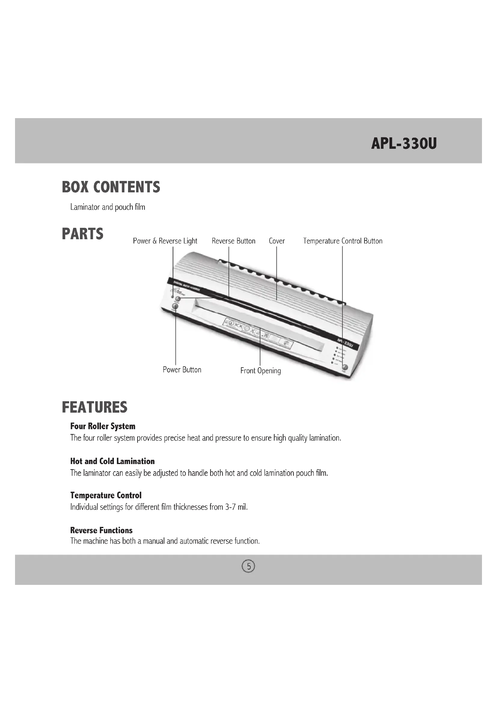 BOX CONTENTS Laminator and pouch film PARTS FEATURES Four Roller System The four roller system provides precise heat and pressure to ensure high quality lamination. Hot and Cold Lamination The laminator can easily be adjusted to handle both hot and cold lamination pouch film. Temperature Control Individual settings for different film thicknesses from 3-7 mil. Reverse Functions The machine has both a manual and automatic reverse function. Reverse Button Power & Reverse Light Temperature Control Button Front Opening Power Button Cover6 OPeRATION Hot Lamination [Before laminating important or unique documents, always test a pouch through the laminator using a similar document.]
