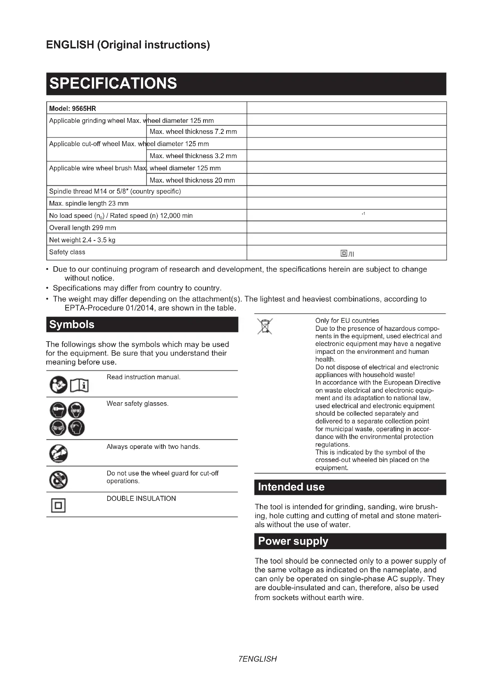 - The weight may dier depending on the attachment(s). The lightest and heaviest combinations, according to EPTA-Procedure 01/2014, are shown in the table. Symbols The followings show the symbols which may be used for the equipment. Be sure that you understand their meaning before use. Read instruction manual. Wear safety glasses. Always operate with two hands. Do not use the wheel guard for cut-o operations. DOUBLE INSULATION Only for EU countries Due to the presence of hazardous compo- nents in the equipment, used electrical and electronic equipment may have a negative impact on the environment and human health. Do not dispose of electrical and electronic appliances with household waste! In accordance with the European Directive on waste electrical and electronic equip- ment and its adaptation to national law, used electrical and electronic equipment should be collected separately and delivered to a separate collection point for municipal waste, operating in accor- dance with the environmental protection regulations. This is indicated by the symbol of the crossed-out wheeled bin placed on the equipment. Intended use The tool is intended for grinding, sanding, wire brush- ing, hole cutting and cutting of metal and stone materi- als without the use of water. Power supply The tool should be connected only to a power supply of the same voltage as indicated on the nameplate, and can only be operated on single-phase AC supply. They are double-insulated and can, therefore, also be used from sockets without earth wire.8 ENGLISH Noise The typical A-weighted noise level determined according to EN62841-2-3: Model Sound pressure level (L