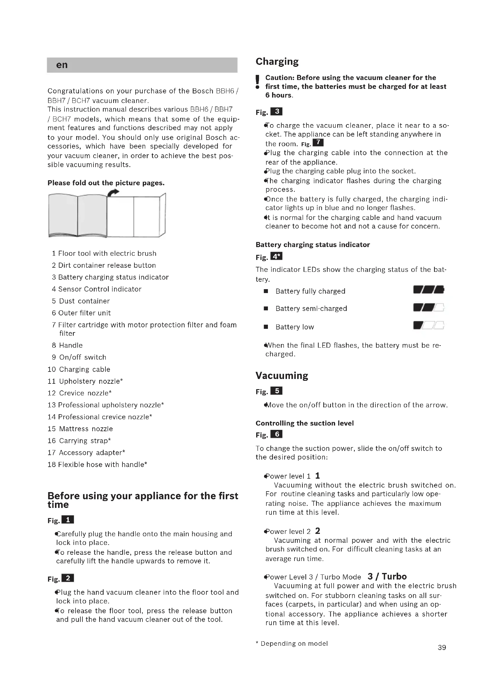 - je nach Ausstattung39 Congratulations on your purchase of the Bosch BBH6 / BBH7 / BCH7 vacuum cleaner. This instruction manual describes various BBH6 / BBH7 / BCH7 models, which means that some of the equip- ment features and functions described may not apply to your model. You should only use original Bosch ac- cessories, which have been specially developed for your vacuum cleaner, in order to achieve the best pos- sible vacuuming results. Please fold out the picture pages. 1 Floor tool with electric brush 2 Dirt container release button 3 Battery charging status indicator 4 Sensor Control indicator 5 Dust container 6 Outer filter unit 7 Filter cartridge with motor protection filter and foam filter 8 Handle 9 On/off switch 10 Charging cable 11 Upholstery nozzle* 12 Crevice nozzle* 13 Professional upholstery nozzle* 14 Professional crevice nozzle* 15 Mattress nozzle 16 Carrying strap* 17 Accessory adapter* 18 Flexible hose with handle* Before using your appliance for the first time Fig.