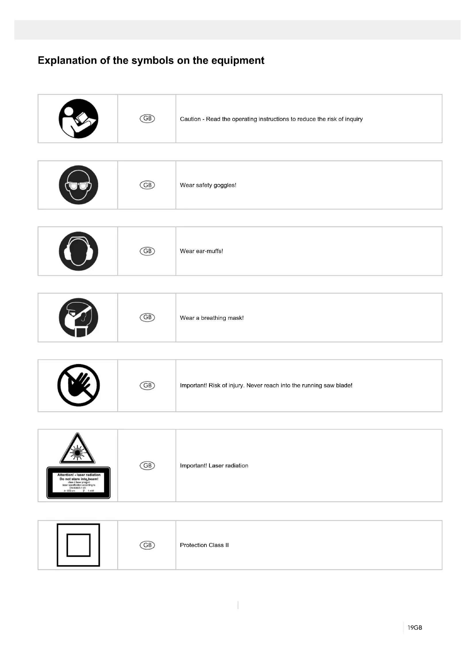 1 Safety precautions – Warning! Do not use damaged or deformed saw blades. – Replace a worn table insert. – Only use saw blades recommended by the man- ufacturer which conform to EN 847-1. – Make sure that a suitable saw blade for the ma- terial to be cut is selected. – Wear suitable personal protective equipment. This includes: – Hearing protection to avoid the risk of becom- ing hearing impaired, – Respiratory protection to avoid the risk of in- haling harmful dust, – Wear gloves when handling saw blades and rough materials. Carry saw blades in a con- tainer whenever practical. – Wear goggles. Sparks generated during work or splinters, chippings and dust coming from the device can lead to loss of eyesight. – Connect a dust collecting device to the electric tool when sawing wood. The emission of dust is inuenced, among other things, by the type of material to be processed, the signicance of local separation (collection or source) and the correct setting of the hood/guide plates/guides. – Do not use saw blades made of high-speed alloy steel (HSS steel). 11 Do not use the cable for purposes for which it is not intended – Do not use the cable to pull the plug out of the outlet. Protect the cable from heat, oil and sharp edges. 12 Secure the workpiece – Use the clamping devices or a vice to hold the workpiece in place. In this manner, it is held more securely than with your hand. – An additional support is necessary for long work- pieces (table, trestle, etc.) in order to prevent the machine from tipping over. – Always press the workpiece rmly against the working plate and stop in order to prevent bounc- ing and twisting of the workpiece. 13 Avoid abnormal posture – Make sure that you have secure footing and al- ways maintain your balance. – Avoid awkward hand positions in which a sudden slip could cause one or both hands to come into contact with the saw blade. 14 Take care of your tools – Keep cutting tools sharp and clean in order to be able to work better and more safely. – Follow the instructions for lubrication and for tool replacement. – Check the connection cable of the electric tool regularly and have it replaced by a recognised specialist when damaged. – Check extension cables regularly and replace them when damaged. – Keep the handle dry, clean and free of oil and grease. 15 Pull the plug out of the outlet – Never remove loose splinters, chips or jammed wood pieces from the running saw blade. – During non-use of the electric tool or prior to main- tenance and when replacing tools such as saw blades, bits, milling heads. 16 Do not leave a tool key inserted – Before switching on, make sure that keys and ad- justing tools are removed. 17 Avoid inadvertent starting – Make sure that the switch is switched off when plugging the plug into an outlet. 18 Use extension cables for outdoors – Only use approved and appropriately identied extension cables for use outdoors. – Only use cable reels in the unrolled state. 19 Remain attentive – Pay attention to what you are doing. Remain sen- sible when working. Do not use the electric tool when you are distracted. 20 Check the electric tool for potential damage – Protective devices and other parts must be care- fully inspected to ensure that they are fault-free and function as intended prior to continued use of the electric tool. – Check whether the moving parts function fault- lessly and do not jam or whether parts are dam- aged. All parts must be correctly mounted and all conditions must be fullled to ensure fault-free operation of the electric tool.23GB 5 Clean grease, oil and water off of the clamping sur- faces. 6 Do not use any loose reducing rings or bushes for the reducing of holes on saw blades. 7 Make sure that xed reducer rings for securing the insertion tool have the same diameter and have at least 1/3 of the cutting diameter. 8 Make sure that xed reducer rings are parallel to each other. 9 Handle insertion tool with caution. They are ideally stored in the originally package or special contain- ers. Wear protective gloves in order to improve grip and to further reduce the risk of injury. 10 Prior to the use of insertion tools, make sure that all protective devices are properly fastened. 11 Prior to use, make sure that the insertion tool meets the technical requirements of this electric tool and is properly fastened. 12 Only use the supplied saw blade for cutting wood, never for the processing of metals. Attention: Laser radiation Do not stare into the beam Class 2 laser