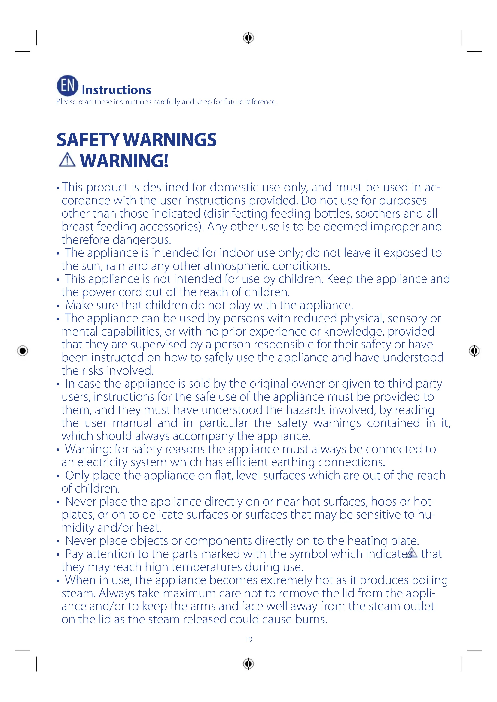 - This product is destined for domestic use only, and must be used in ac- cordance with the user instructions provided. Do not use for purposes other than those indicated (disinfecting feeding bottles, soothers and all breast feeding accessories). Any other use is to be deemed improper and therefore dangerous.