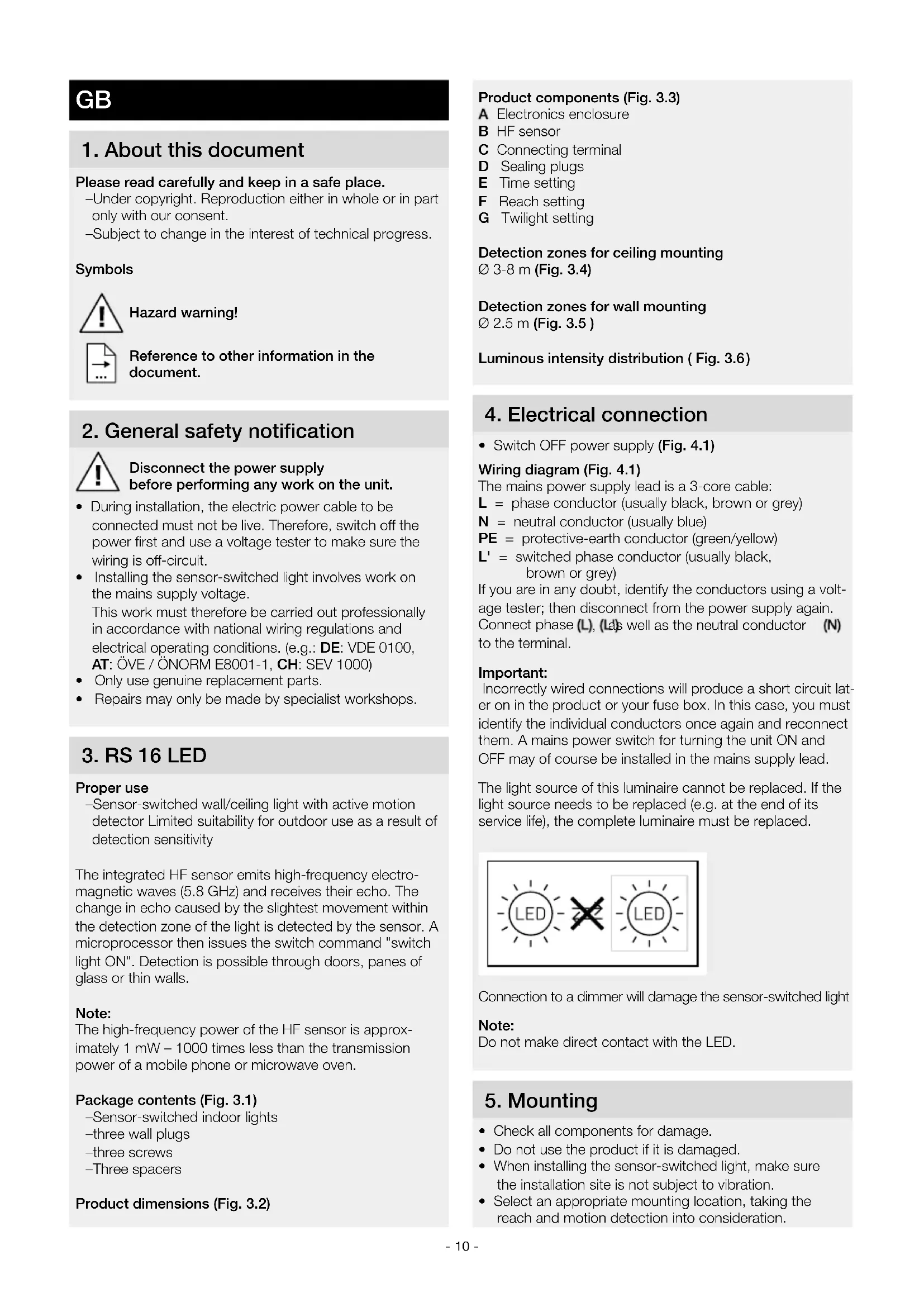 Proper use – Sensor-switched wall/ceiling light with active motion detector Limited suitability for outdoor use as a result of detection sensitivity The integrated HF sensor emits high-frequency electro- magnetic waves (5.8 GHz) and receives their echo. The change in echo caused by the slightest movement within the detection zone of the light is detected by the sensor. A microprocessor then issues the switch command "switch light ON". Detection is possible through doors, panes of glass or thin walls. Note: The high-frequency power of the HF sensor is approx- imately 1mW – 1000 times less than the transmission power of a mobile phone or microwave oven. Package contents (Fig. 3.1) – Sensor-switched indoor lights – three wall plugs – three screws – Three spacers Product dimensions (Fig. 3.2)- 11 -• Not suitable for ceiling mounting with surface-mounted power supply lead (Fig.5.1)Mounting procedure• Detach shade from enclosure (Fig. 5.2)• Mark drill holes (Fig. 5.3)• Drill holes and insert wall plugs (Fig. 5.4)• Pierce sealing plug for power supply lead (Fig.5.5)• Concealed wiring (Fig. 5.6)• With spacers for surface mounting (Fig. 5.7)• Connect conductors (Fig. 5.8)• Switch ON power supply (Fig. 5.9)• Make settings ➜ "6.Function"• Fit shade (Fig 5.9)
